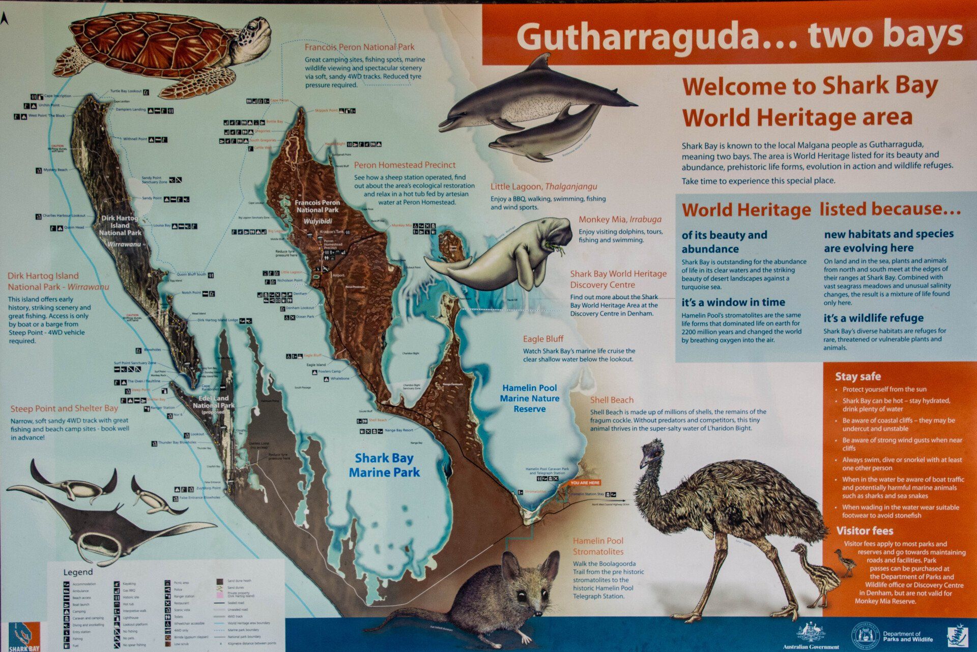 Angelika war schon 1991 in dieser Region. Wir zusammen kamen 2019 auf unserer Australien-Rundreise von Darwin nach Perth. Mit einem Mietfahrzeug fuhren wir direkt nach Norden mit einer Zwischenübernachtung in Kalbarri bis nach Exmouth, um die Strecke dann langsam mit mehren Zwischenstopps wieder zurück zu fahren. Gesehen haben wir den Kalbarri Nationalpark, den Cape Range Nationalpark, den François Peron Nationalpark, den Nambung Nationalpark und den Yancheb Nationalpark. In Hamlin Pool und am Lake Thetis haben wir die ältesten Lebewesen unseres Planeten bewundert (Stromatolithen), in der Shark Bay (UNESCO Weltnaturerbe) Große Tümmler (Delfine) direkt am Strand beobachtet, am Eagle Bluff Lookout haben wir Haie im Flachwasser schwimmen sehen, während ein Weißbauchseeadler über uns schwebte, in der Shell Bay haben wir bewundert, wie die Natur Billionen von kleinen Muscheln zu einem 9 m hohen Strand aufgeworfen hat, wir sahen schneeweiße riesige Sanddünen und die Pinnackles Desert mit ihrem goldgelben Sand und den tausenden von bizarren Felsnadeln darin. In dieser Region haben wir die größte Anzahl frei lebender Känguruhs und Emus der ganzen Australien-Tour gesehen und natürlich viele andere Tiere wie z.B. einen Stachelschwanzwaran. Erschreckend war es über die Brücke eines breiten Stromes zu fahren, der komplett ausgetrocknet war. Übernachtet haben wir auf der Tour in Perth, Kalbarri, Exmouth, Coral Bay, Monkey Mia, Cervantes und Yancheb. In 2020 endete unsere Corona-Pandemie-Kreuzfahrt in Freemantle bzw. Perth - von hier aus wurden wir von der Bundesregierung evakuiert.