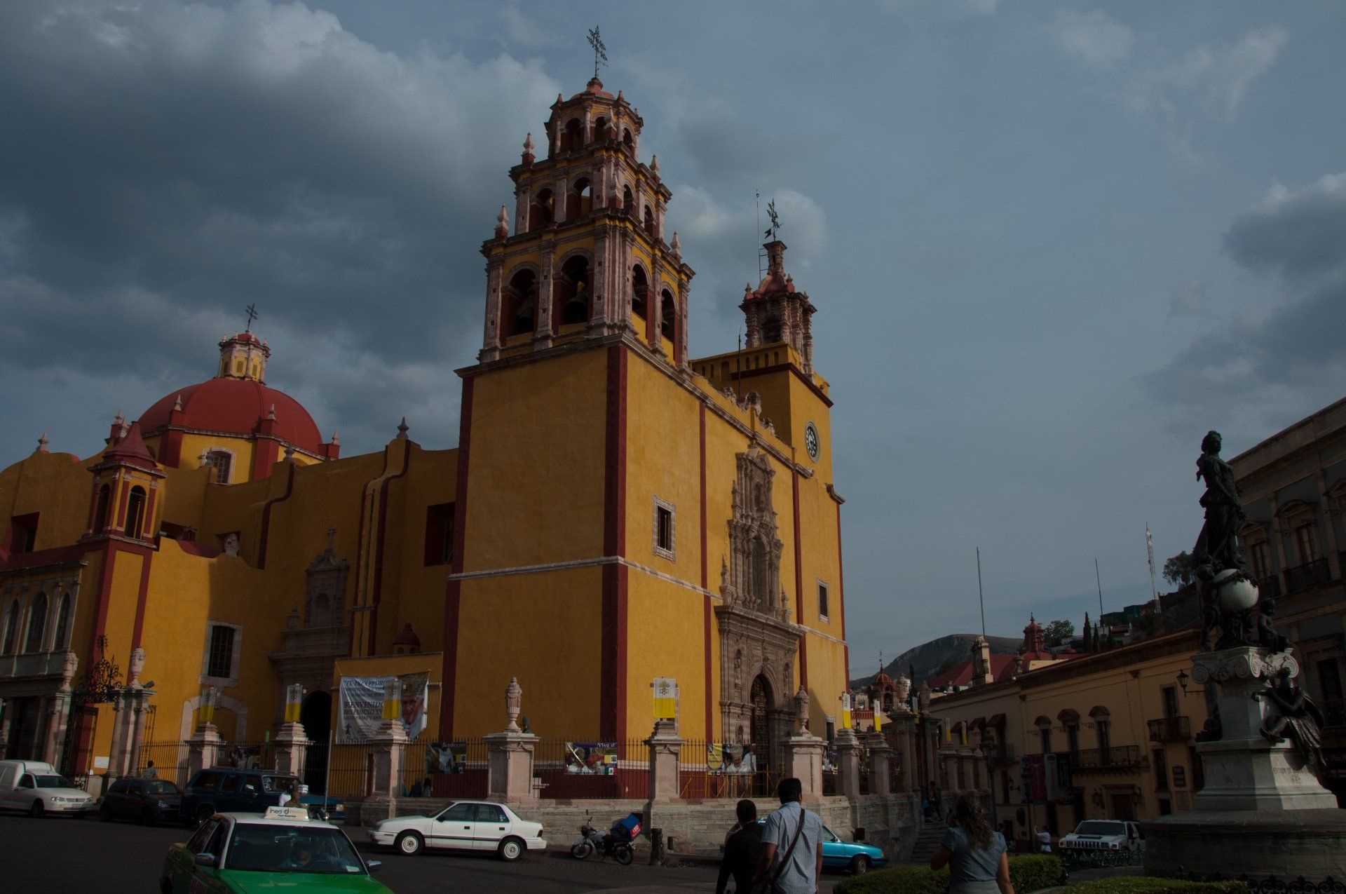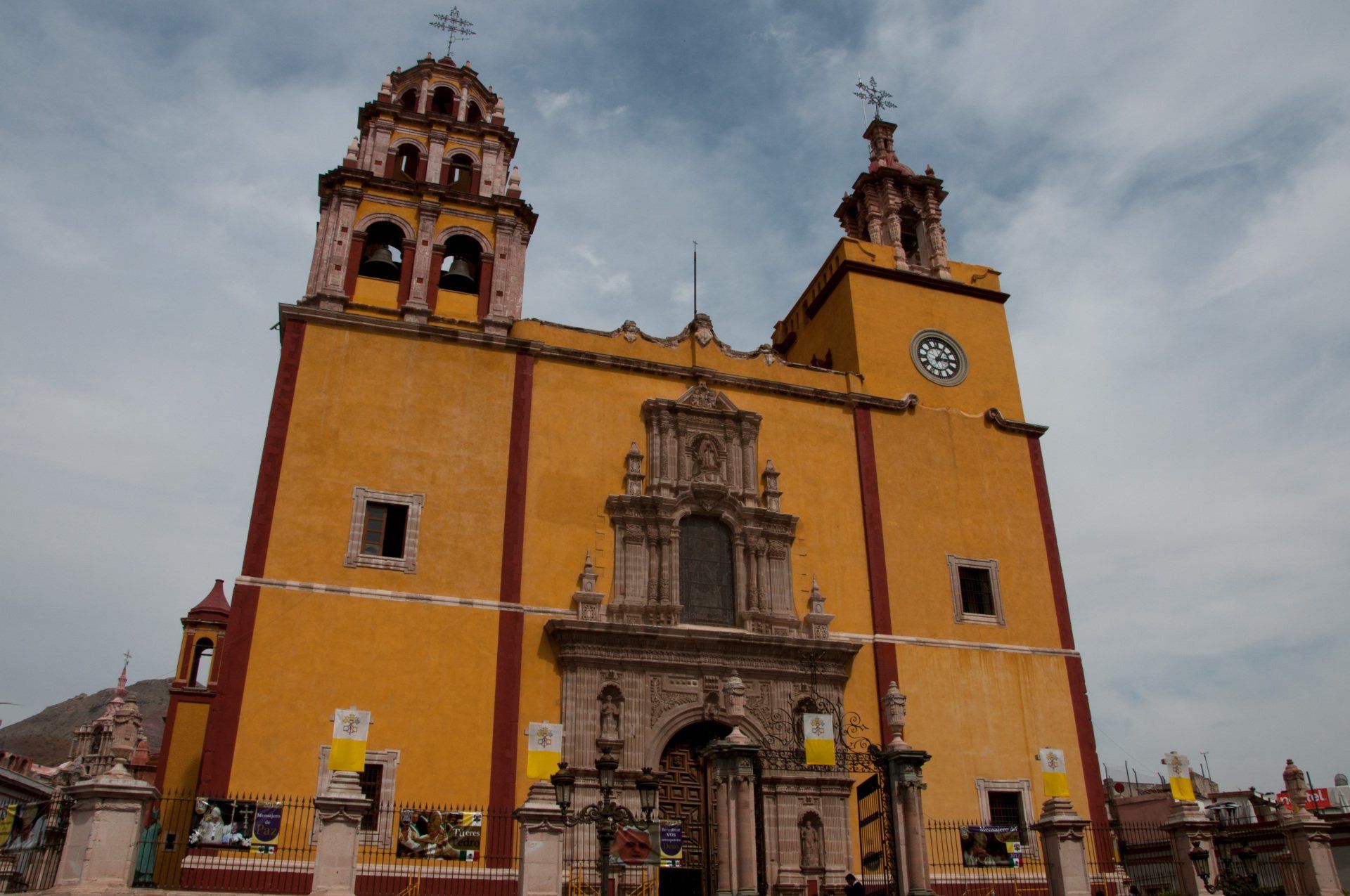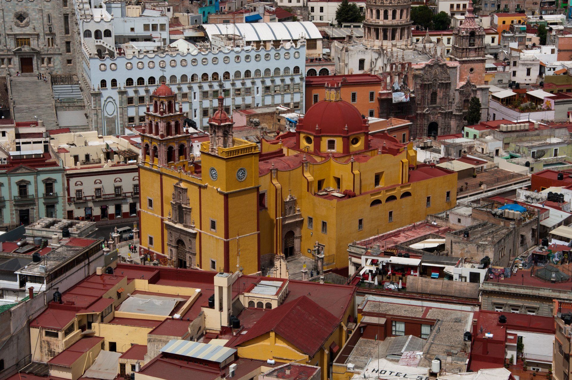 Guanajuato. Wir waren kurz vor dem Papst hier, es war schon alles auf den Besuch vorbereitet (Plakate, Flaggen). Hier war früher das Weltzentrum des Silber-Bergbaues (zwischen 1557 und 1810 wurden hier 75% des Weltförderung aus dem Boden geholt), deshalb sieht es unter der Stadt und in den umliegenden Bergen aus wie in einem Maulwurf-Bau. Die Stadt hat die Stollen genutzt um Straßen hindurch zu bauen. Die vielen bunten Häuser geben der Stadt ein besonderes Flair. Ein besonderes Museum is das "Museo de las Momias de Guanajuatro" (Museum der Mumien). Weiterhin besuchten wir die