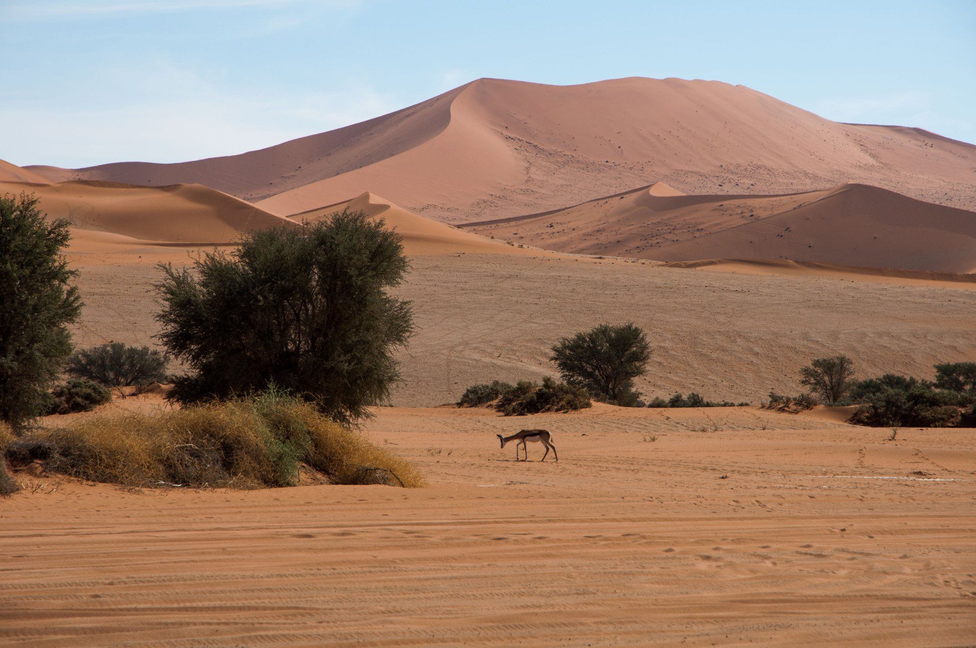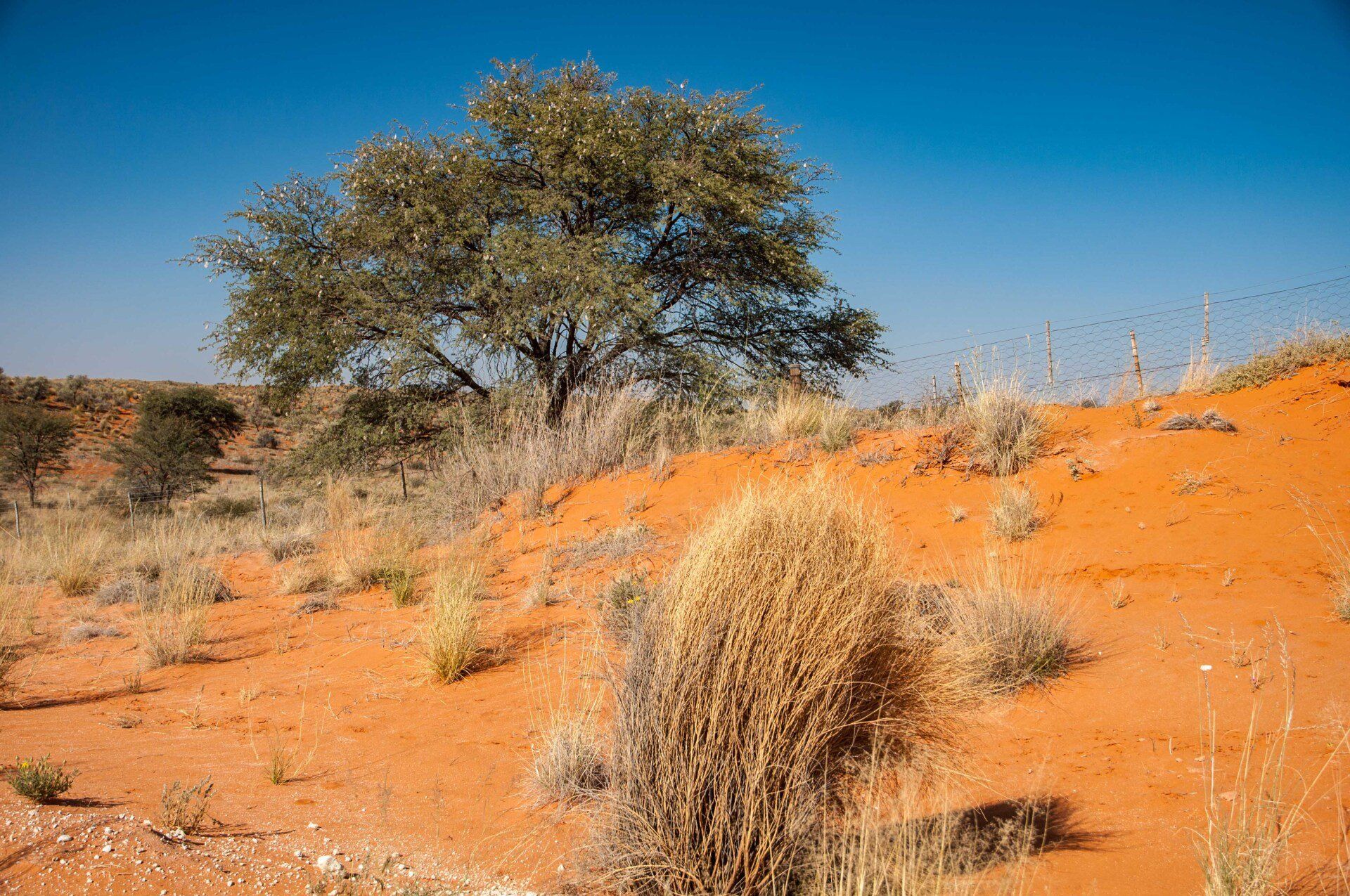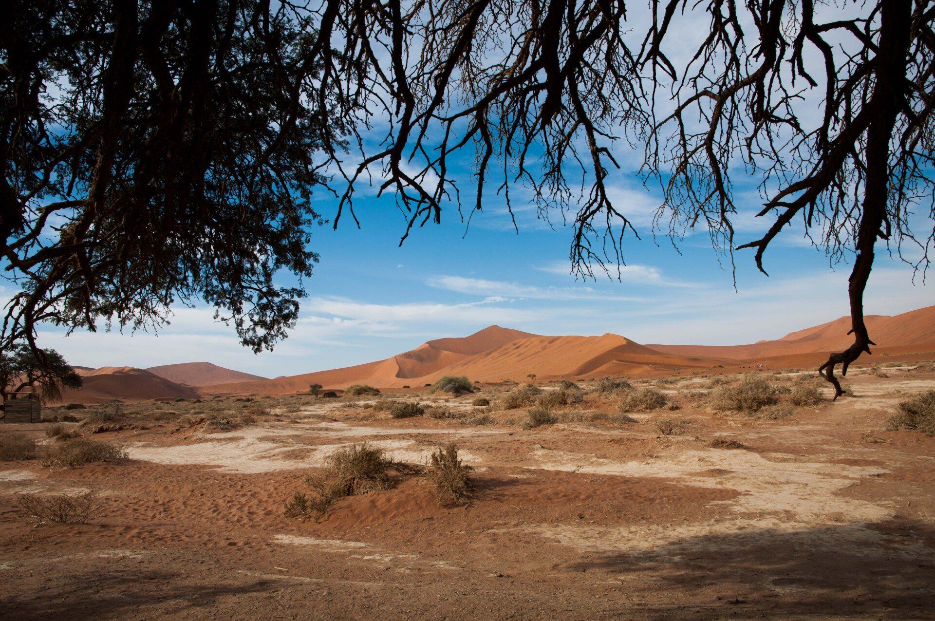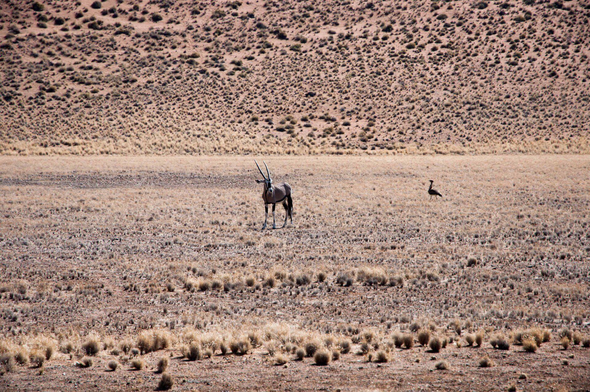 Wir waren 2013 auf einer Gruppen-Rundreise durch Namibia in dieser Region. Es war nur ein Tag, aber was für einer! Es gab nur ein Thema, die Namib und das Sossusvlei mit seinen großen roten Sanddünen. Sossus bedeutet in der Sprache der Nama "Blinder Fluss", weil der Tsuchap, der nur in regenreichen Jahren etwas Wasser führt, dann in den Dünen bei Sossusvlei versickert, 50 km bevor er den Atlantik erreichen könnte. Er hinterlässt nur trockene weiße Salz-Ton-Pfannen genannt "Vlei", die zusammen mit den roten Dünen, blauem Himmel und den abgestorbenen Bäumen ein spezielles Bild liefert (wohl das bekannteste Bild aus der Namib). Die Düne 45 darf von den Touristen bestiegen werden, sie heisst so weil sie 45 km vom Beginn der Zufahrt entfernt ist. Erstaunlich war auch die Fauna die in dieser Wüste anzutreffen war: Spiesbock, Angola-Springbock, Namib-Gecko, Webervögel, Riesen-Trappe, Wüstenmaus und eine Raupe haben wir gesehen, aber dies sind nicht die Einzigen. Der ganze Bereich dieses Tages gehört zum Naukluft-Namib-Nationalpark und das gesamte Namib-Sandmeer inklusive dem Sossusvlei wurde 3 Wochen nach unserem Besuch in das UNESCO Weltnaturerbe der Menschheit aufgenommen. Übernachtet hatten wir ab Ende des Tages in Sesriem. Am nächsten Morgen ging es weiter durch die Tirasberge in die südlichste Region Namibias, nach IIKaras. Auf der Rückfahrt nach Norden von der Region IIKaras kommend fuhren wir relativ nahe der Grenze zu Botswana durch die Kalahari in die Region Hardap bis zu unserer nächsten Übernachtung im Kalahari Farmhouse in Stampriet.