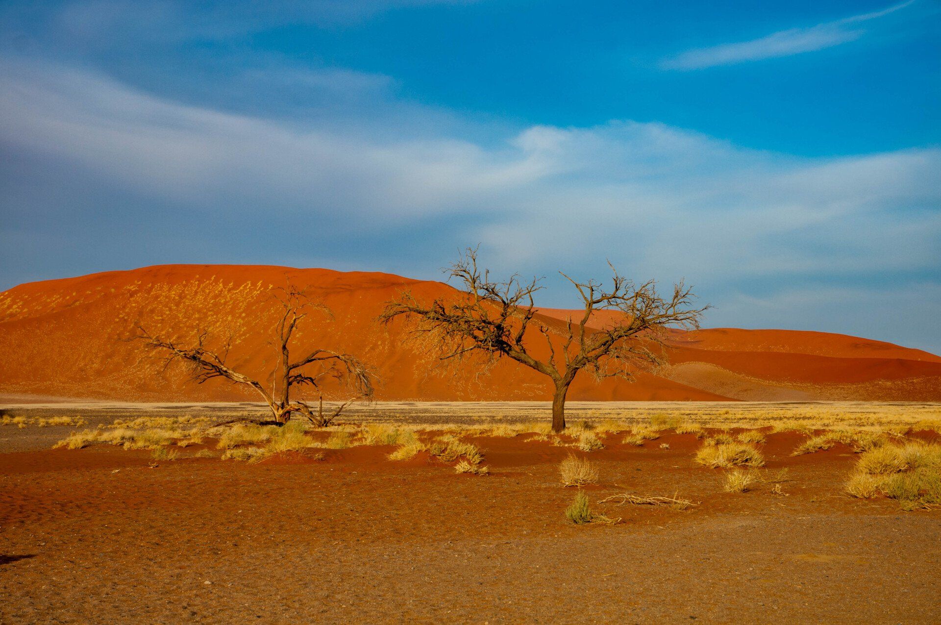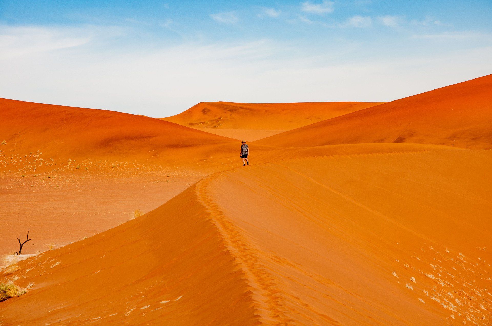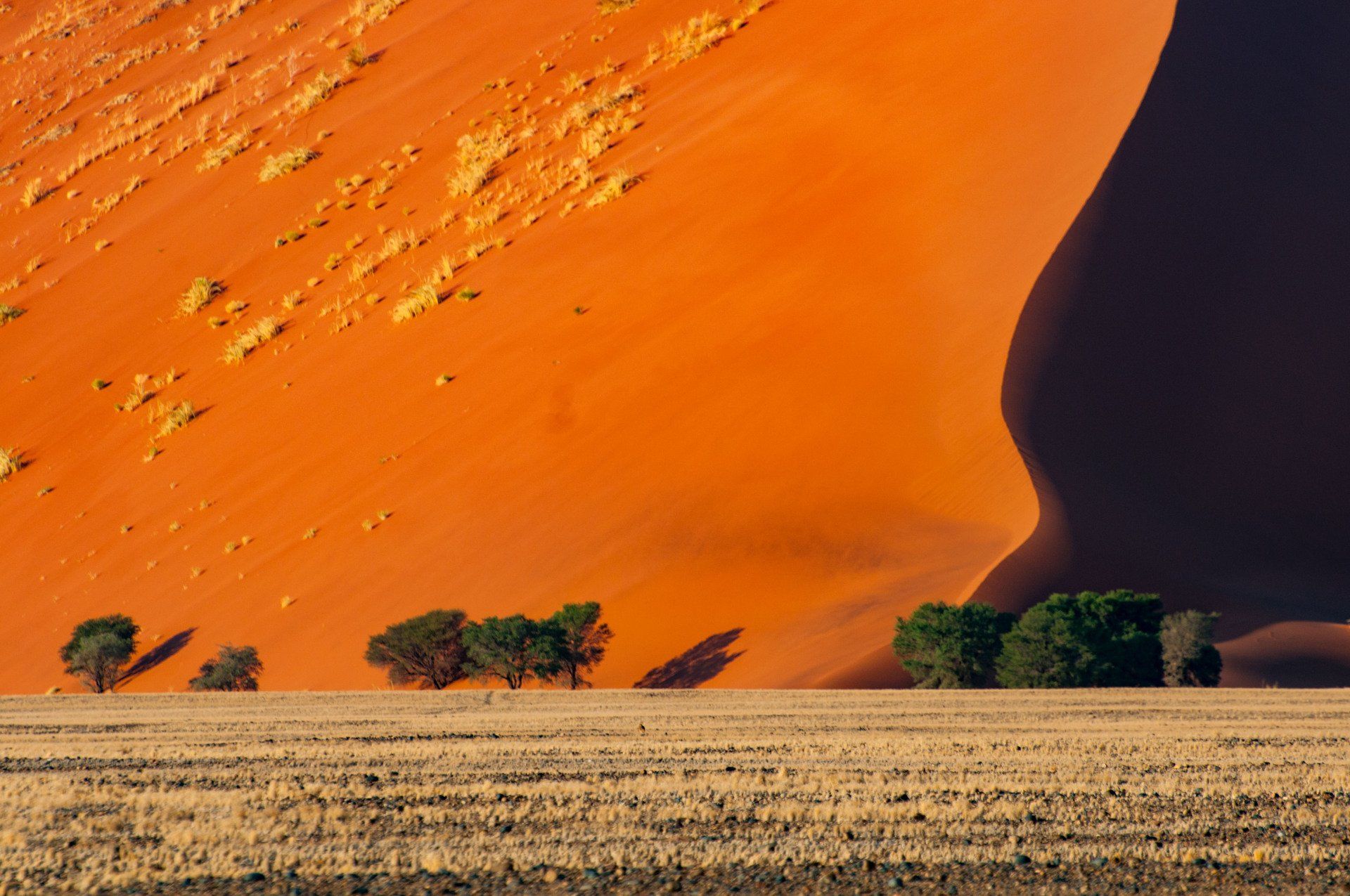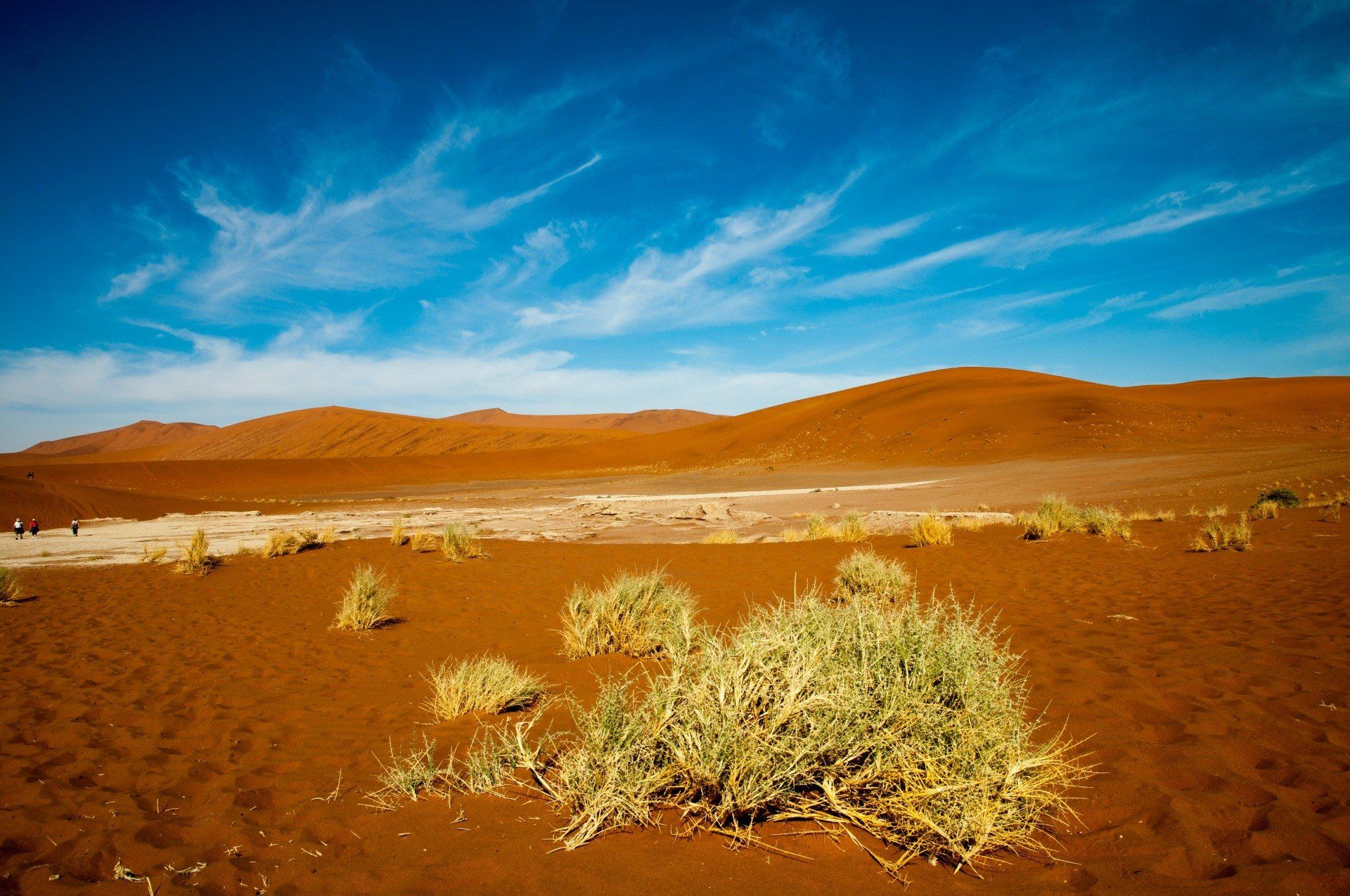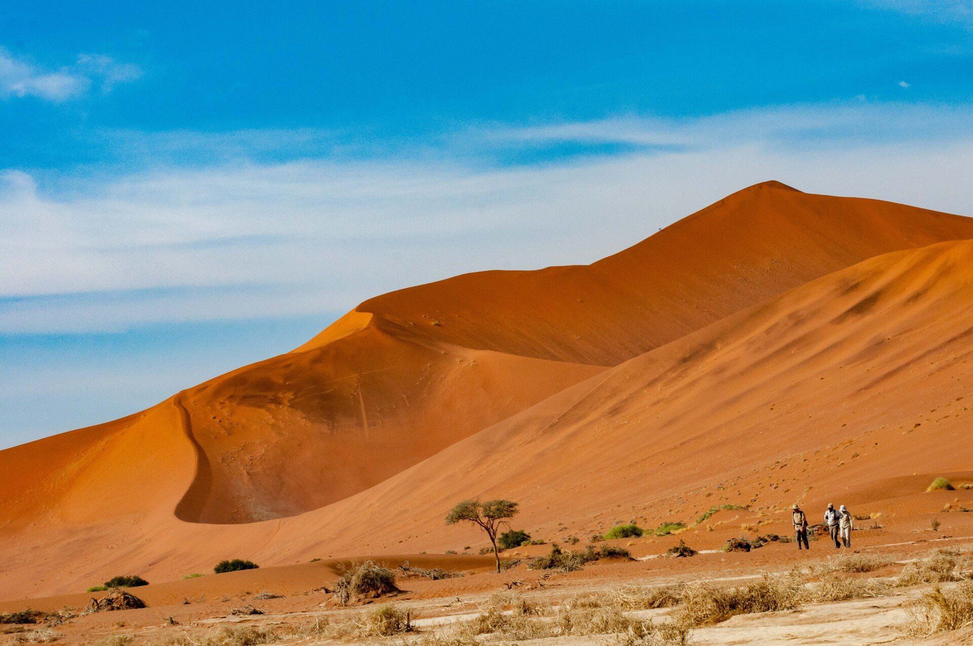 Wir waren 2013 auf einer Gruppen-Rundreise durch Namibia in dieser Region. Es war nur ein Tag, aber was für einer! Es gab nur ein Thema, die Namib und das Sossusvlei mit seinen großen roten Sanddünen. Sossus bedeutet in der Sprache der Nama "Blinder Fluss", weil der Tsuchap, der nur in regenreichen Jahren etwas Wasser führt, dann in den Dünen bei Sossusvlei versickert, 50 km bevor er den Atlantik erreichen könnte. Er hinterlässt nur trockene weiße Salz-Ton-Pfannen genannt "Vlei", die zusammen mit den roten Dünen, blauem Himmel und den abgestorbenen Bäumen ein spezielles Bild liefert (wohl das bekannteste Bild aus der Namib). Die Düne 45 darf von den Touristen bestiegen werden, sie heisst so weil sie 45 km vom Beginn der Zufahrt entfernt ist. Erstaunlich war auch die Fauna die in dieser Wüste anzutreffen war: Spiesbock, Angola-Springbock, Namib-Gecko, Webervögel, Riesen-Trappe, Wüstenmaus und eine Raupe haben wir gesehen, aber dies sind nicht die Einzigen. Der ganze Bereich dieses Tages gehört zum Naukluft-Namib-Nationalpark und das gesamte Namib-Sandmeer inklusive dem Sossusvlei wurde 3 Wochen nach unserem Besuch in das UNESCO Weltnaturerbe der Menschheit aufgenommen. Übernachtet hatten wir ab Ende des Tages in Sesriem. Am nächsten Morgen ging es weiter durch die Tirasberge in die südlichste Region Namibias, nach IIKaras. Auf der Rückfahrt nach Norden von der Region IIKaras kommend fuhren wir relativ nahe der Grenze zu Botswana durch die Kalahari in die Region Hardap bis zu unserer nächsten Übernachtung im Kalahari Farmhouse in Stampriet.