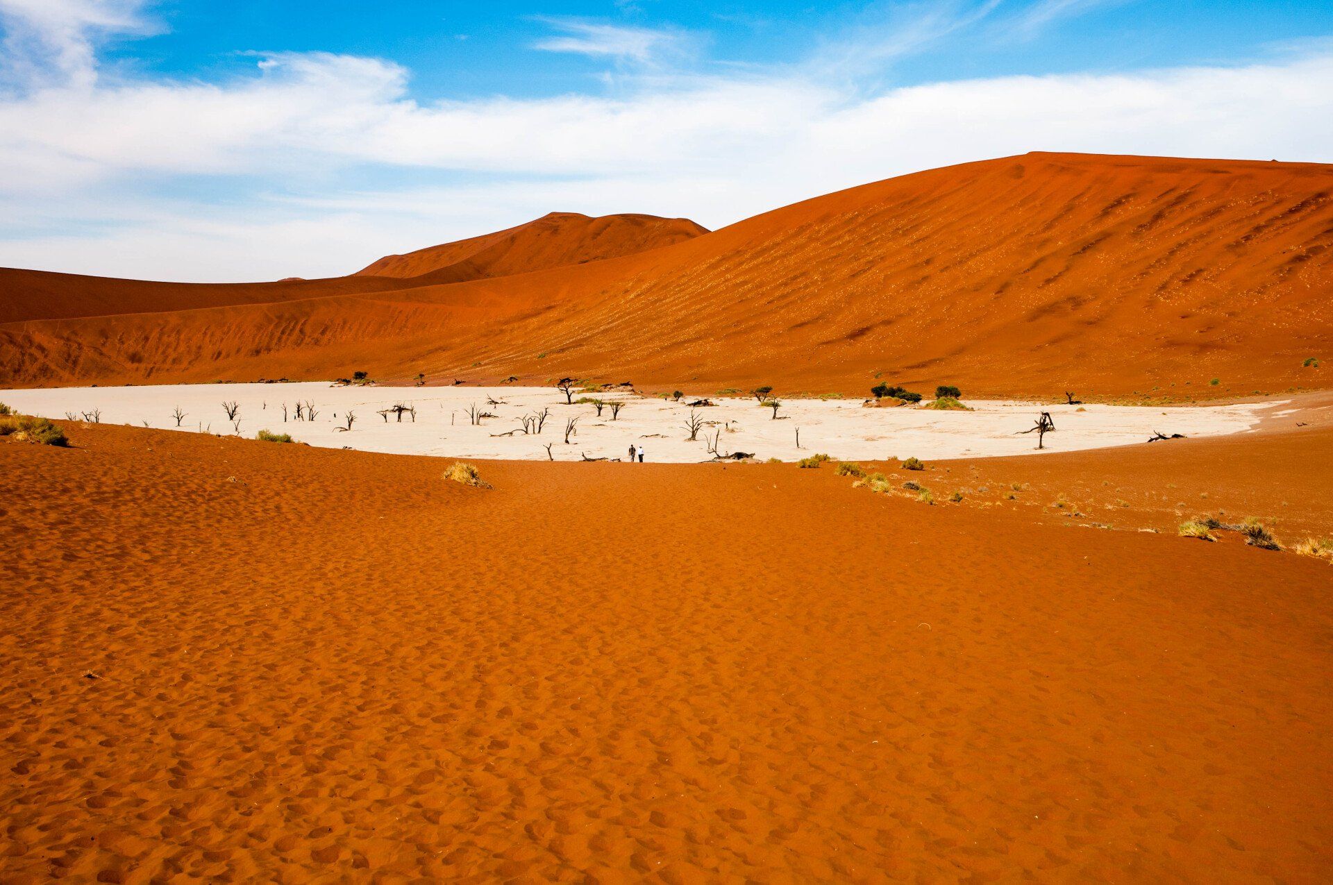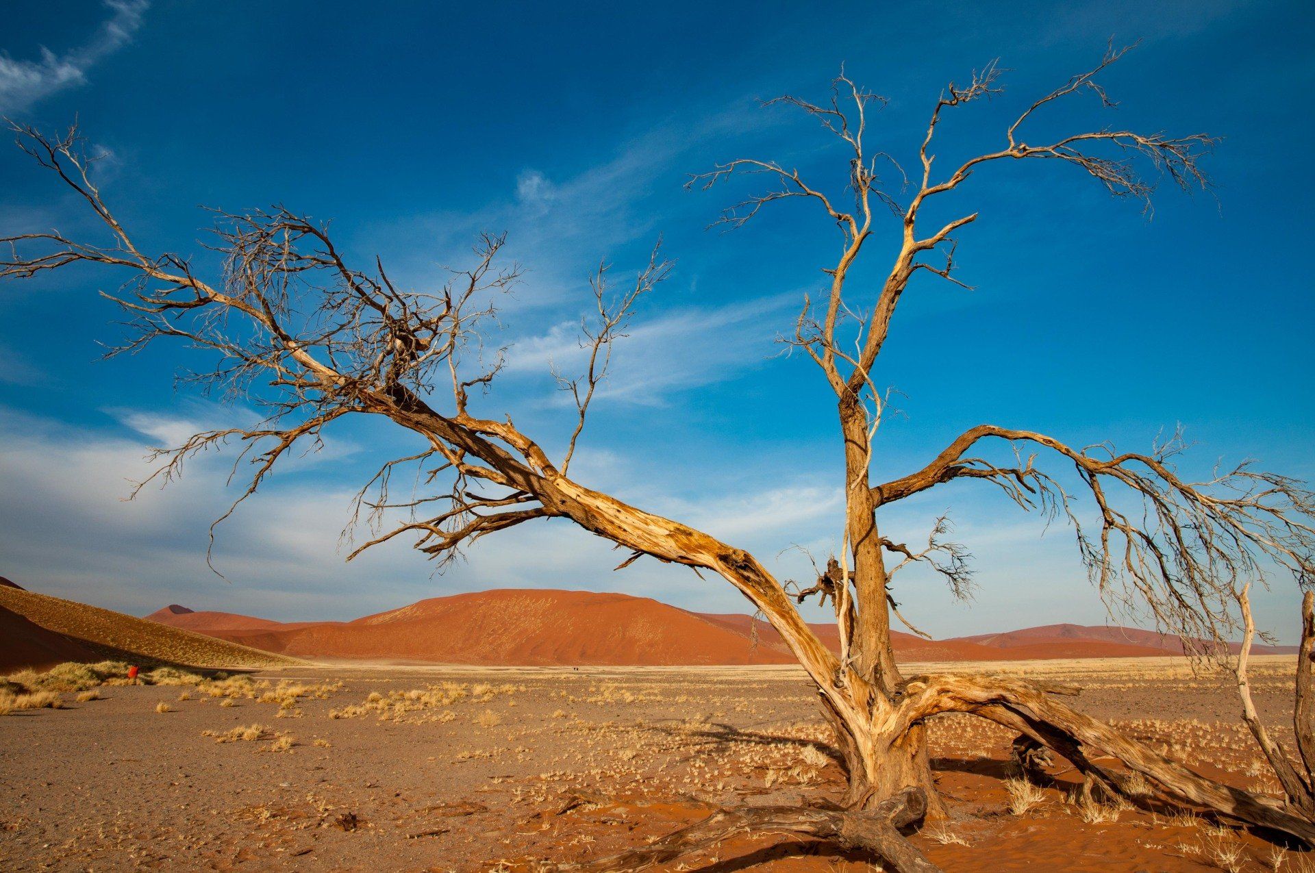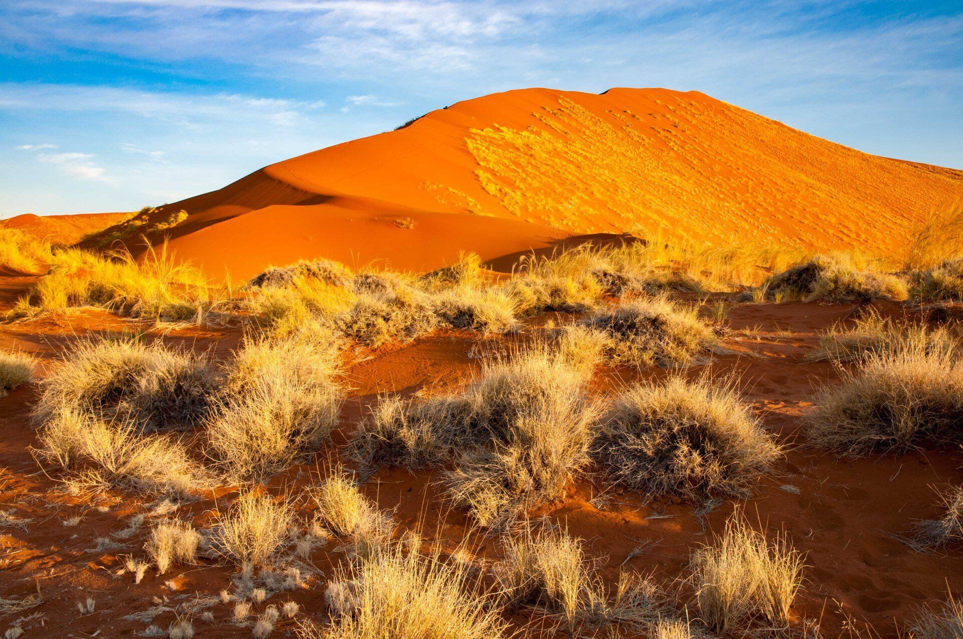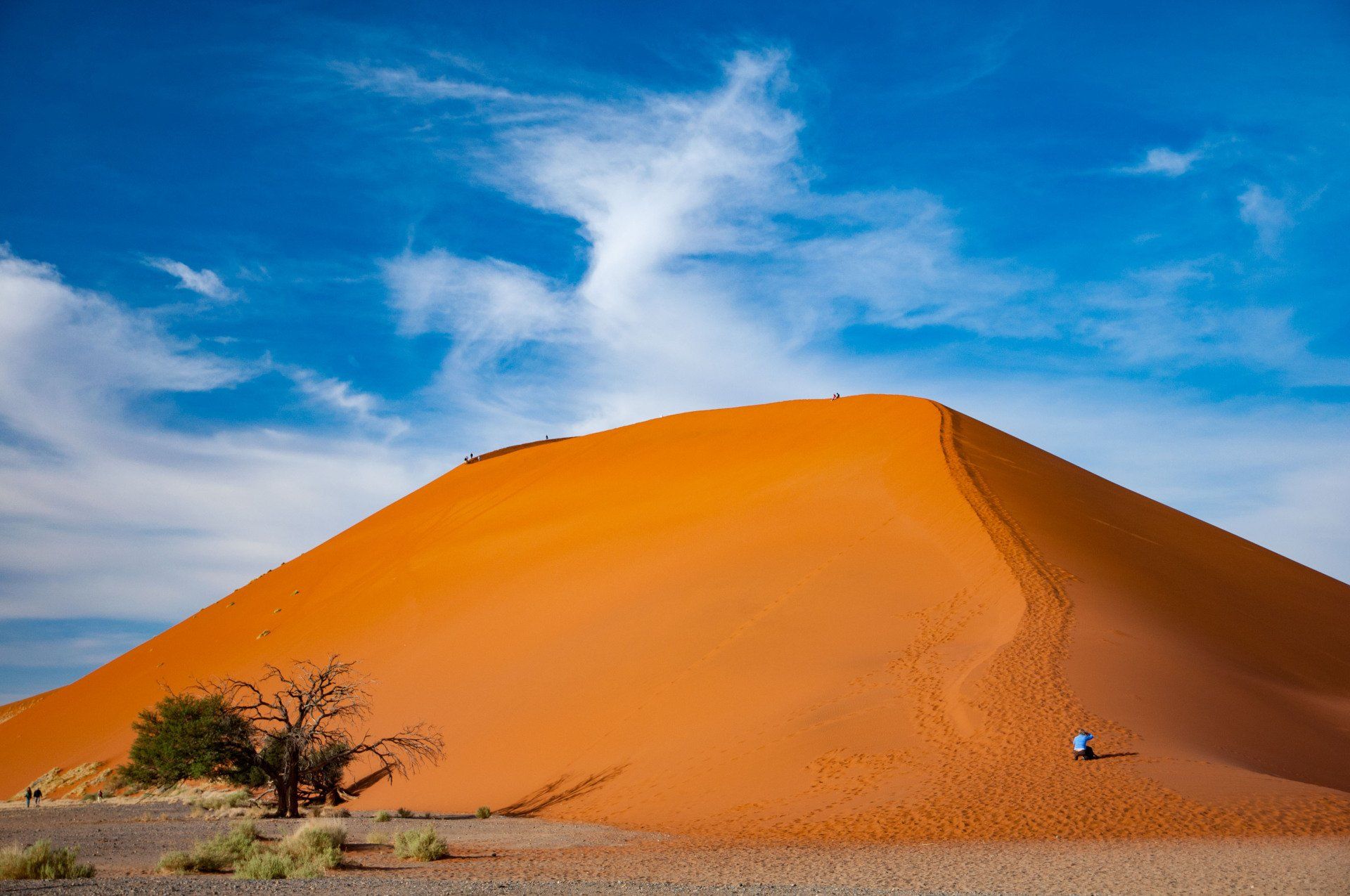 Wir waren 2013 auf einer Gruppen-Rundreise durch Namibia in dieser Region. Es war nur ein Tag, aber was für einer! Es gab nur ein Thema, die Namib und das Sossusvlei mit seinen großen roten Sanddünen. Sossus bedeutet in der Sprache der Nama "Blinder Fluss", weil der Tsuchap, der nur in regenreichen Jahren etwas Wasser führt, dann in den Dünen bei Sossusvlei versickert, 50 km bevor er den Atlantik erreichen könnte. Er hinterlässt nur trockene weiße Salz-Ton-Pfannen genannt "Vlei", die zusammen mit den roten Dünen, blauem Himmel und den abgestorbenen Bäumen ein spezielles Bild liefert (wohl das bekannteste Bild aus der Namib). Die Düne 45 darf von den Touristen bestiegen werden, sie heisst so weil sie 45 km vom Beginn der Zufahrt entfernt ist. Erstaunlich war auch die Fauna die in dieser Wüste anzutreffen war: Spiesbock, Angola-Springbock, Namib-Gecko, Webervögel, Riesen-Trappe, Wüstenmaus und eine Raupe haben wir gesehen, aber dies sind nicht die Einzigen. Der ganze Bereich dieses Tages gehört zum Naukluft-Namib-Nationalpark und das gesamte Namib-Sandmeer inklusive dem Sossusvlei wurde 3 Wochen nach unserem Besuch in das UNESCO Weltnaturerbe der Menschheit aufgenommen. Übernachtet hatten wir ab Ende des Tages in Sesriem. Am nächsten Morgen ging es weiter durch die Tirasberge in die südlichste Region Namibias, nach IIKaras. Auf der Rückfahrt nach Norden von der Region IIKaras kommend fuhren wir relativ nahe der Grenze zu Botswana durch die Kalahari in die Region Hardap bis zu unserer nächsten Übernachtung im Kalahari Farmhouse in Stampriet.