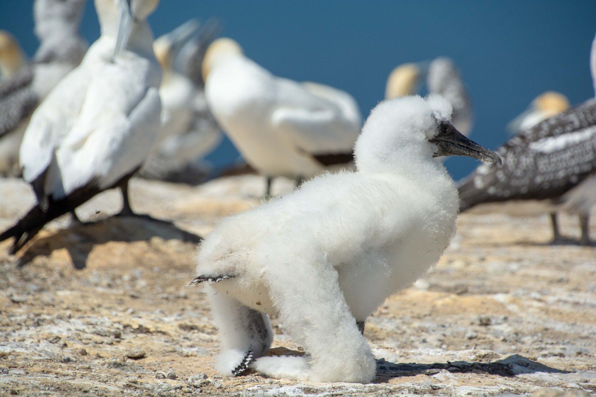 Clifton ist möglich per Traktor mit Anhänger über den Strand zu einer Kolonie am Fuß der Klippen. Wir machten aber bisher immer die Tour mit einem Kleinbus über Land zur Kolonie oben auf einem Plateau einer Klippe. Diese Tour ist auch wegen der Zwischenstopps und Aussichten zu empfehlen. An der Kolonie angekommen traut man seinen Augen kaum - tausende Tölpel auf der Fläche von 2 bis 3 Tennisplätzen. Aber die hinterlassen natürlich Jahr für Jahr einige Ausscheidungen und sie sitzen damit auf einem gigantischen Misthaufen - wie sagte der Tour-Leiter so schön "the smell is for free" (der Geruch kostet nichts extra). Für Vogel-Liebhaber und Tierfotografen ist die Tour ein absolutes Muss. Vor Ort hat man eine Stunde Zeit (war Klaus immer zu wenig). Ende Februar/ Anfang März sind hier neben den erwachsenen Vögeln Jungtiere aller Altersklassen. Die jugendlichen Halbstarken probieren mit ihren langen Flügeln klarzukommen und trainieren schon mal Flugübungen im Aufwind am Klippenrand. Die fliegenden erwachsenen Vögel sehen toll aus gegen den stahlblauen Himmel und die Landemanöver auf der überfüllten Fläche sind sehenswert. In