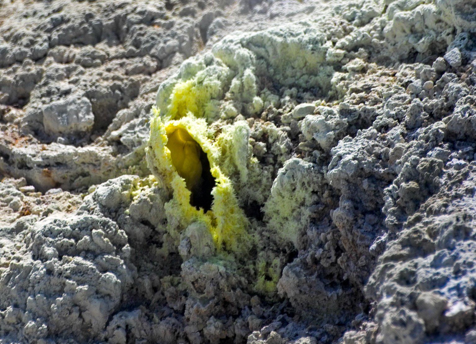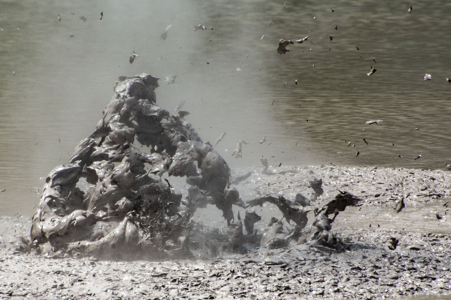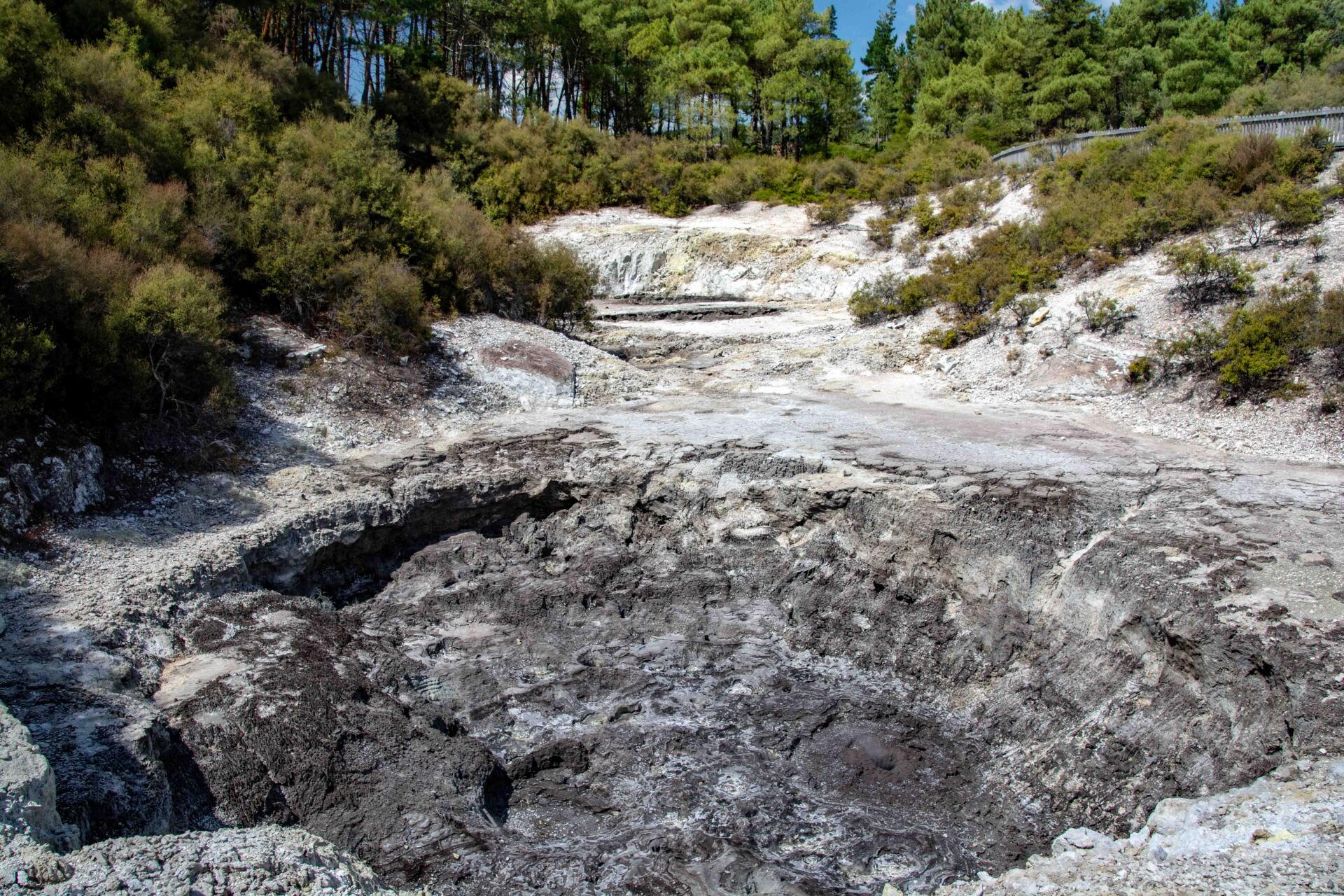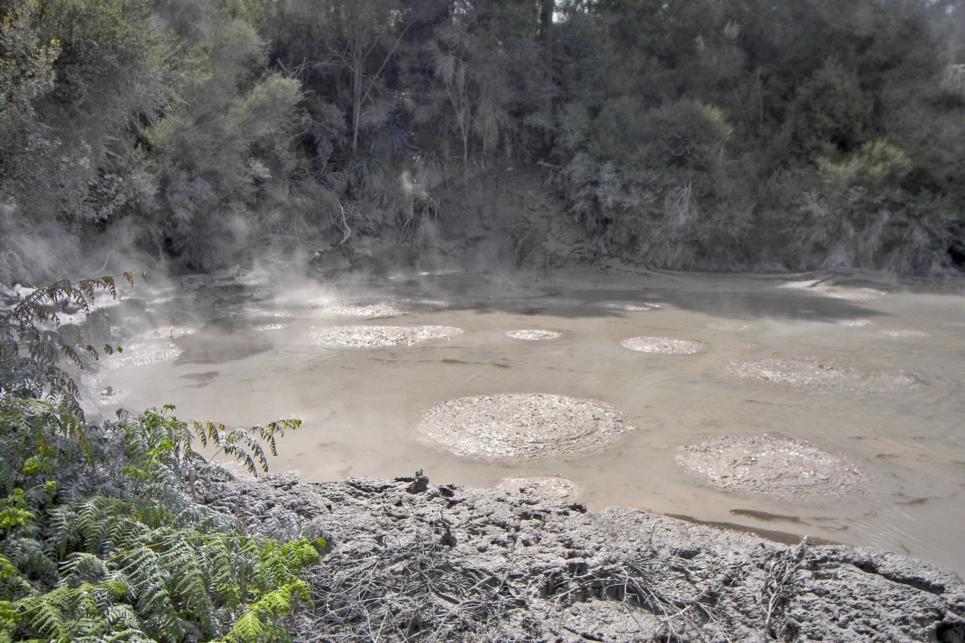 Mud Pools, ein Schlammsee mit heissem Matsch, der durch die Gase, die hier stetig aufsteigen große Blasen macht, die dann spektakulär platzen, und in einer Momentaufnahme sieht jede anders aus. Im restlichen Gebiet gibt es zahlreiche Krater, einen See mit vielen Farbtönen genannt "Die Maler-Palette", eine große
