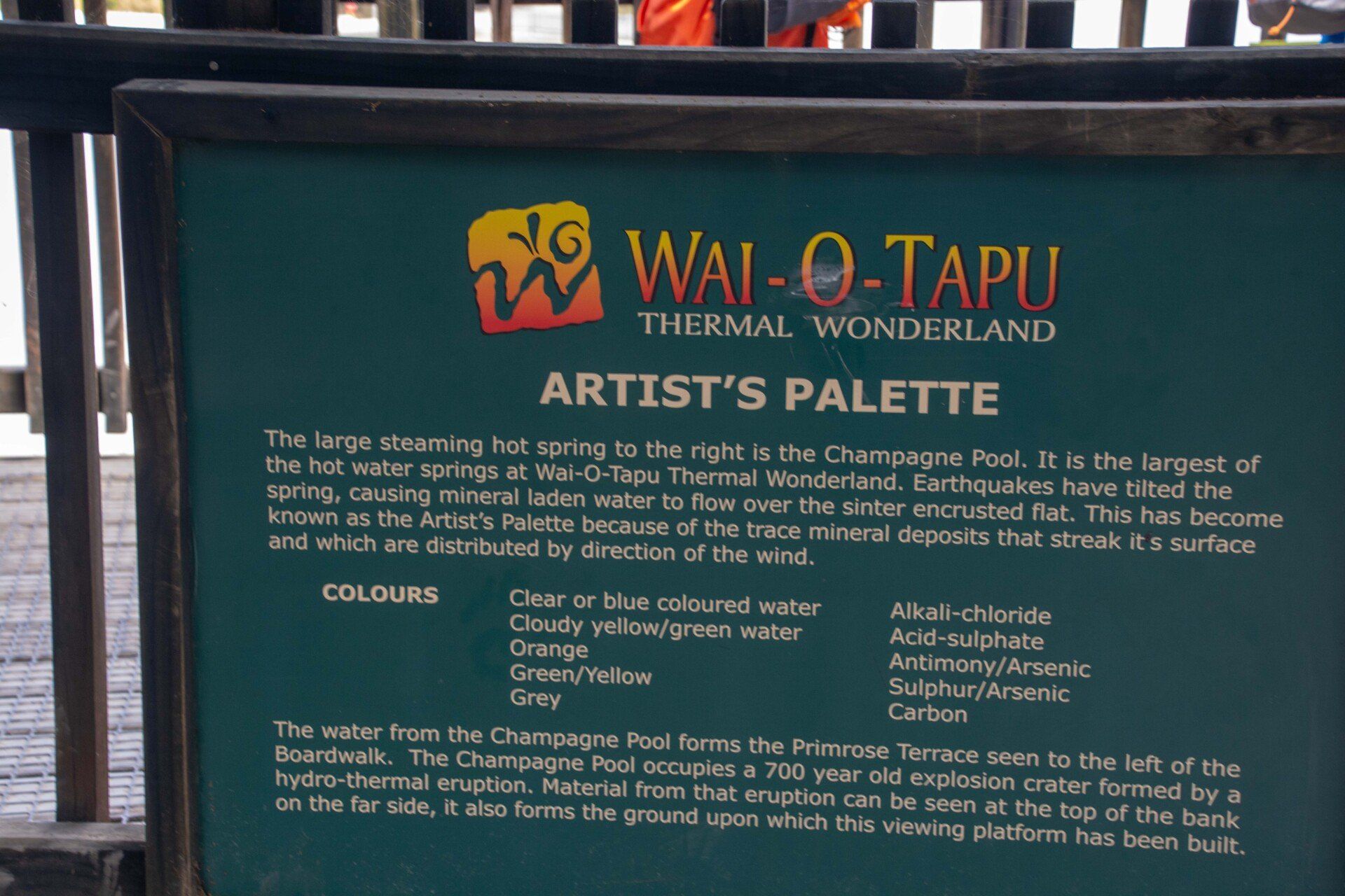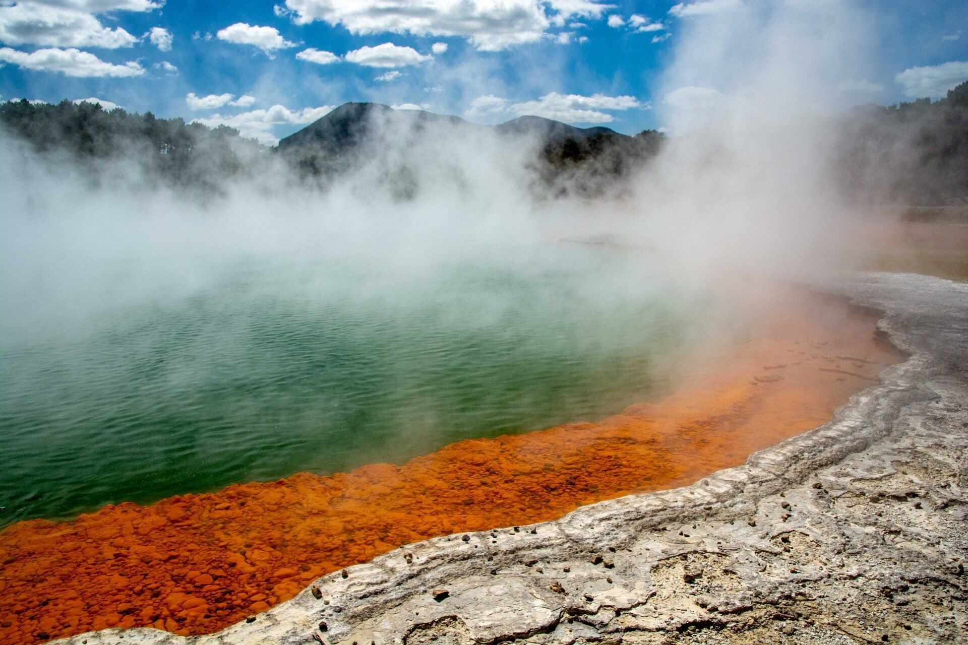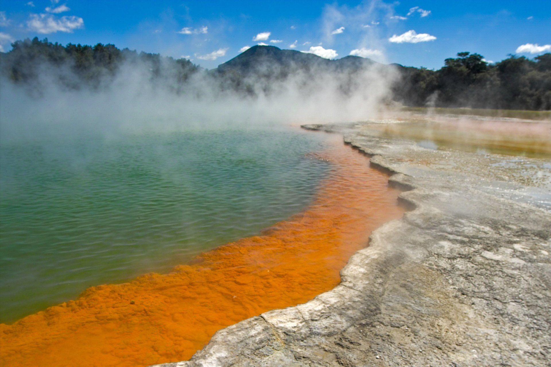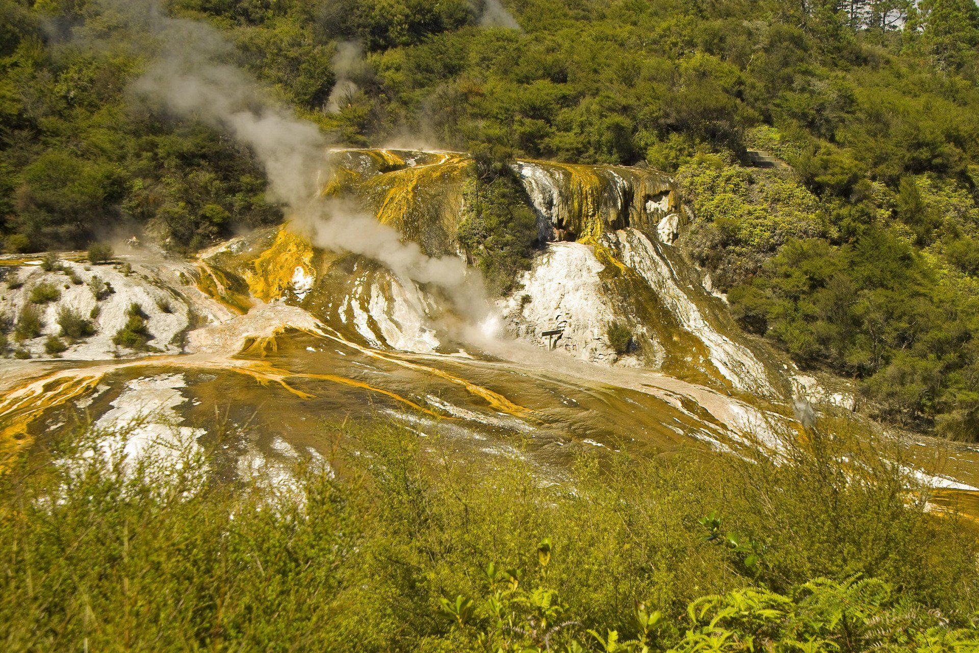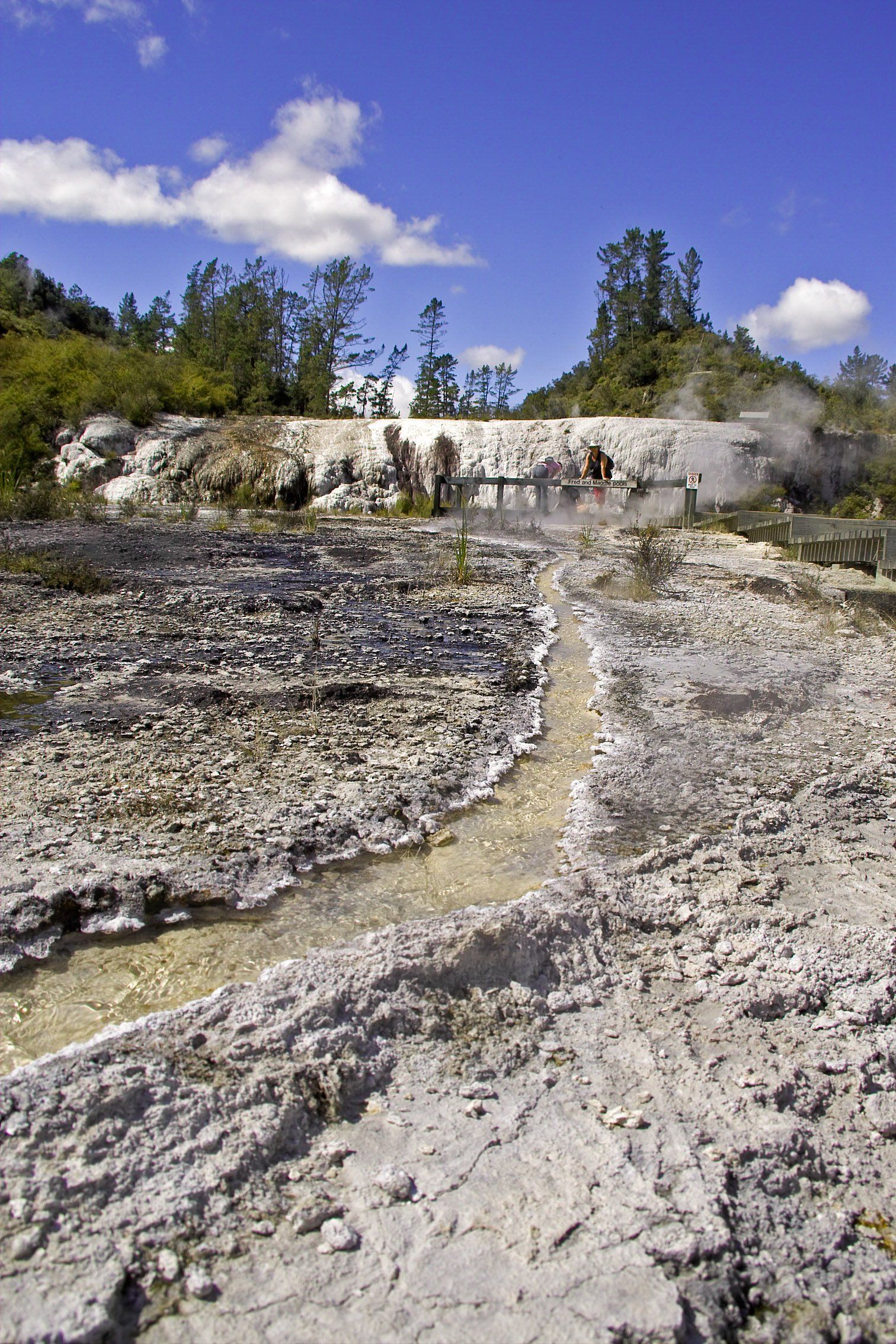 Kalk-Sinter-Platte und den weltbekannten "Champagner Pool", dessen Farben kommen von bestimmten Mineralien, die sich hier ablagern. Der Pool ist ein sehr tief reichender Trichter, in dessen heissem Wasser stetig kleine Gas-Blasen aufsteigen wie im Champagner-Glas, daher sein Name. Die Farbe im
