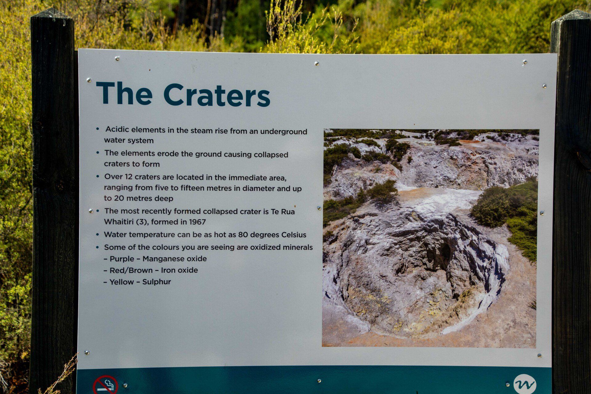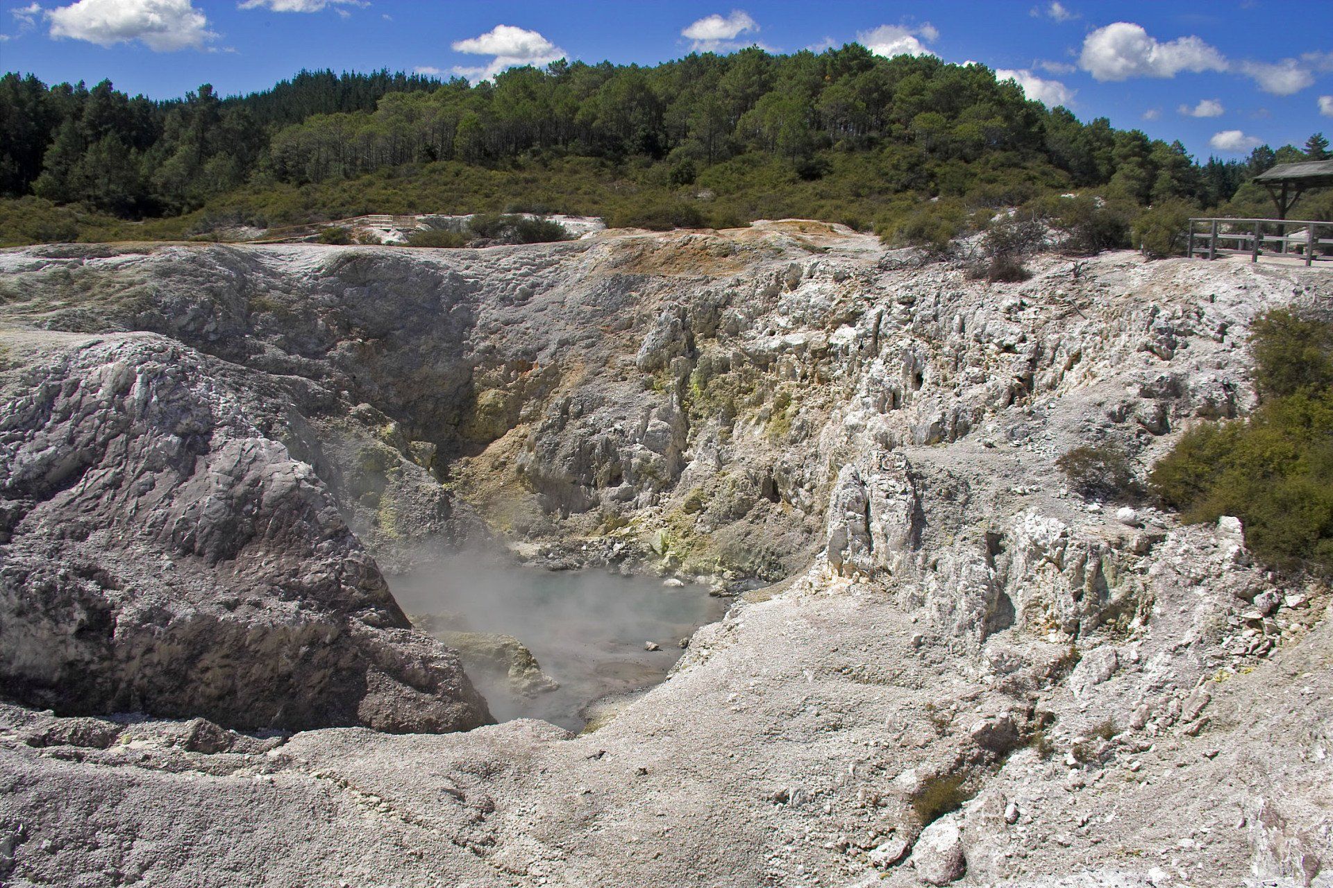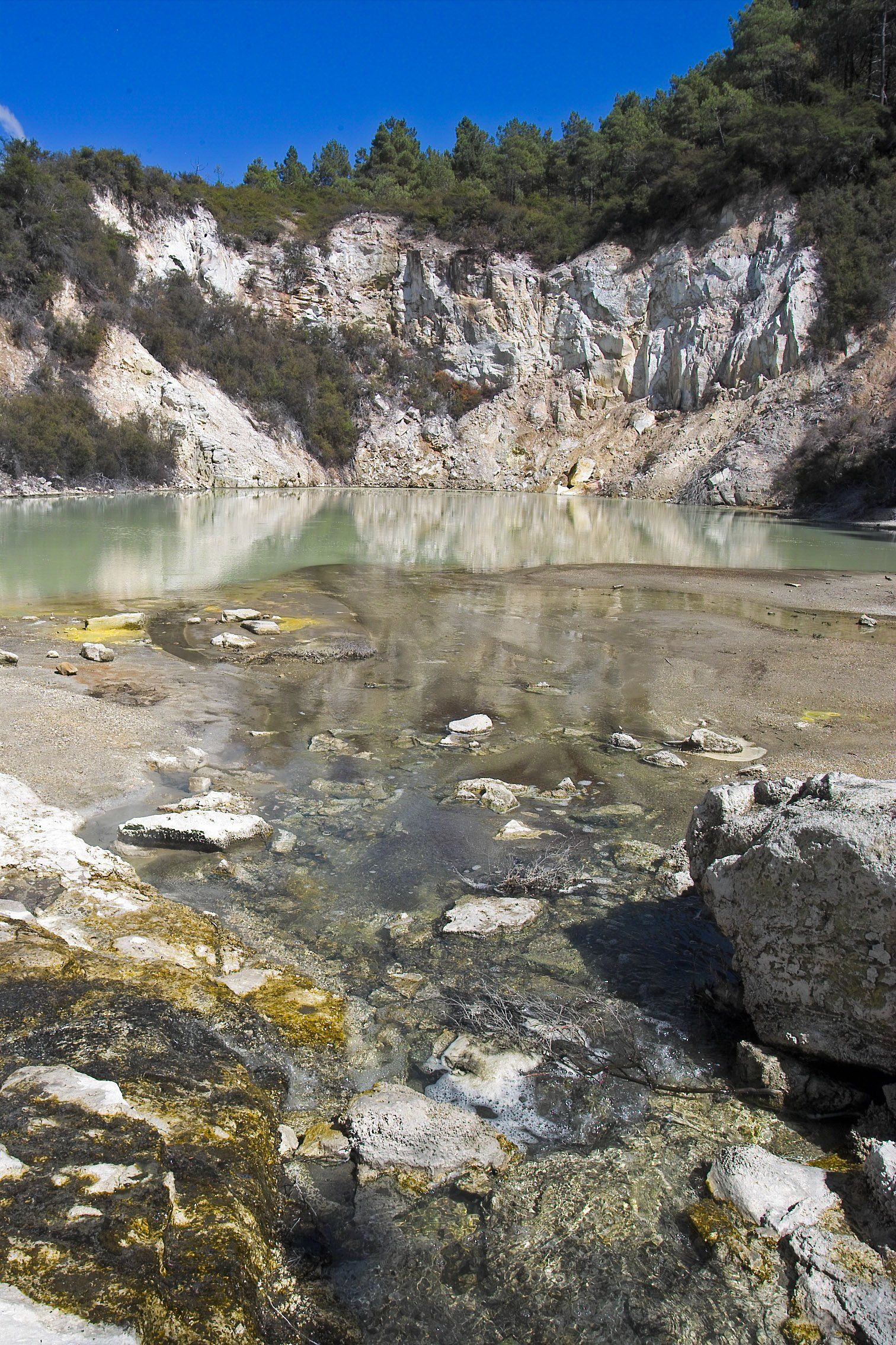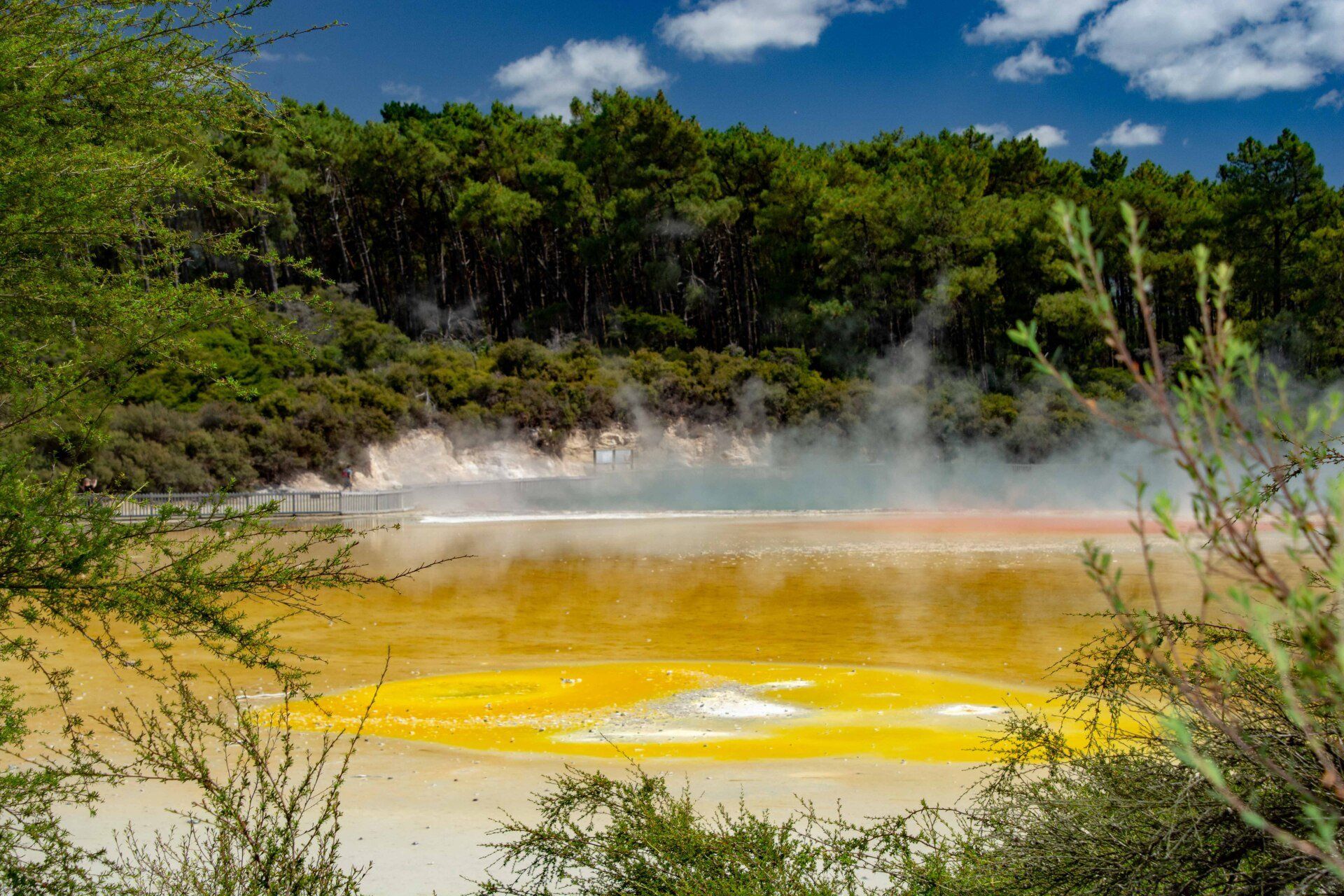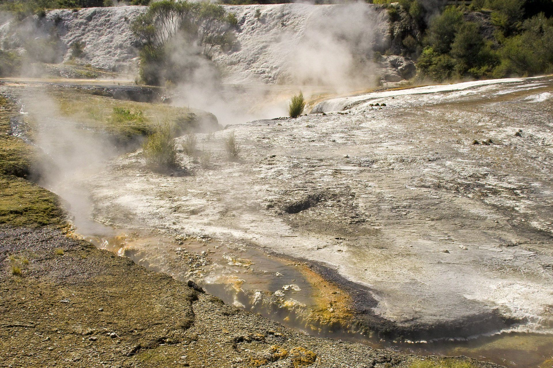 Kalk-Sinter-Platte und den weltbekannten "Champagner Pool", dessen Farben kommen von bestimmten Mineralien, die sich hier ablagern. Der Pool ist ein sehr tief reichender Trichter, in dessen heissem Wasser stetig kleine Gas-Blasen aufsteigen wie im Champagner-Glas, daher sein Name. Die Farbe im
