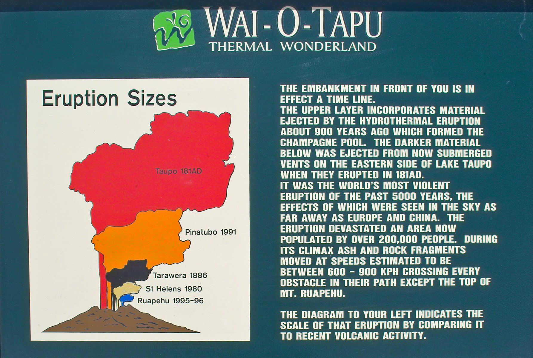 Taupo. Dieser große See (40 x 28 km) ist der mit Wasser gefüllte Krater, der nach einem der größten bekannten Vulkanausbrüche, dem des Mount Taupo, vor 26.500 Jahren entstanden ist. Aus dem See entspringt der