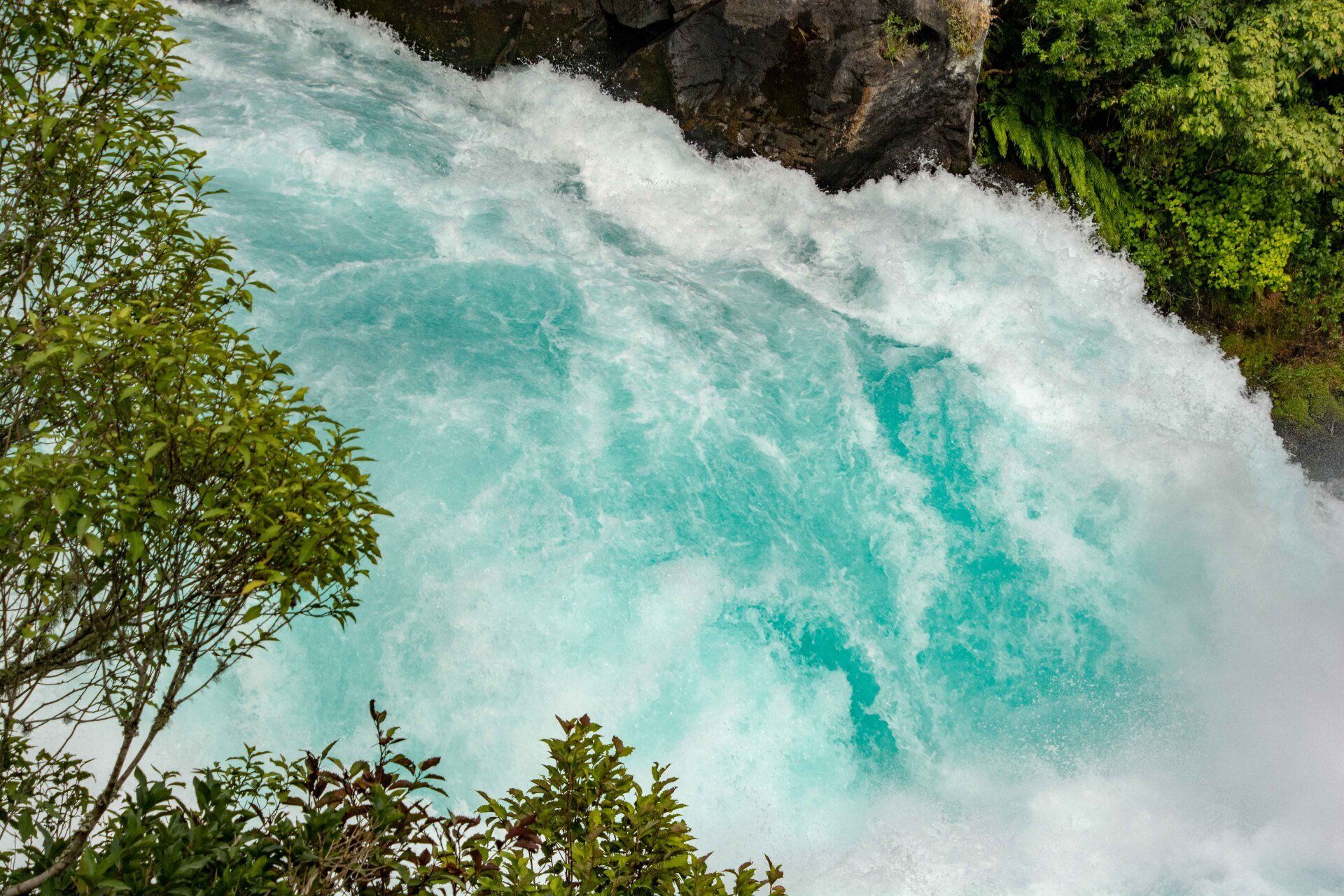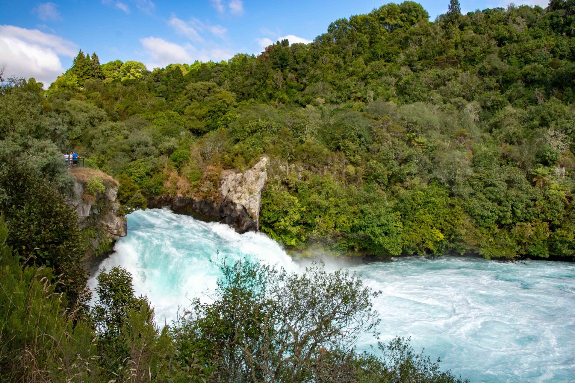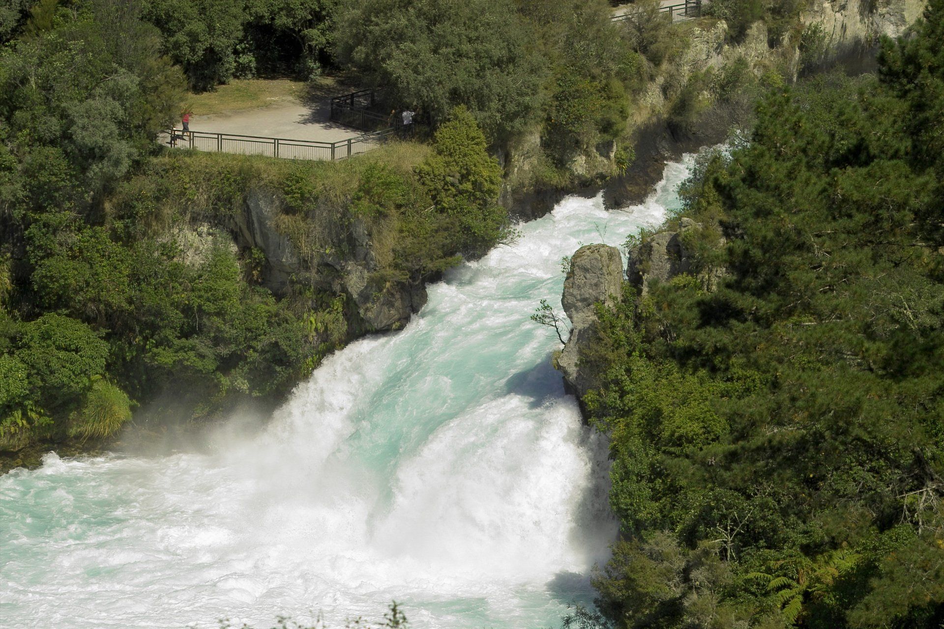 Huka Falls ist nicht sehr hoch, aber die Wassermassen mit durchschnittlich 220.000 Litern pro Sekunde lassen sie sehr wuchtig erscheinen. Nordöstlich von Taupo liegt bei