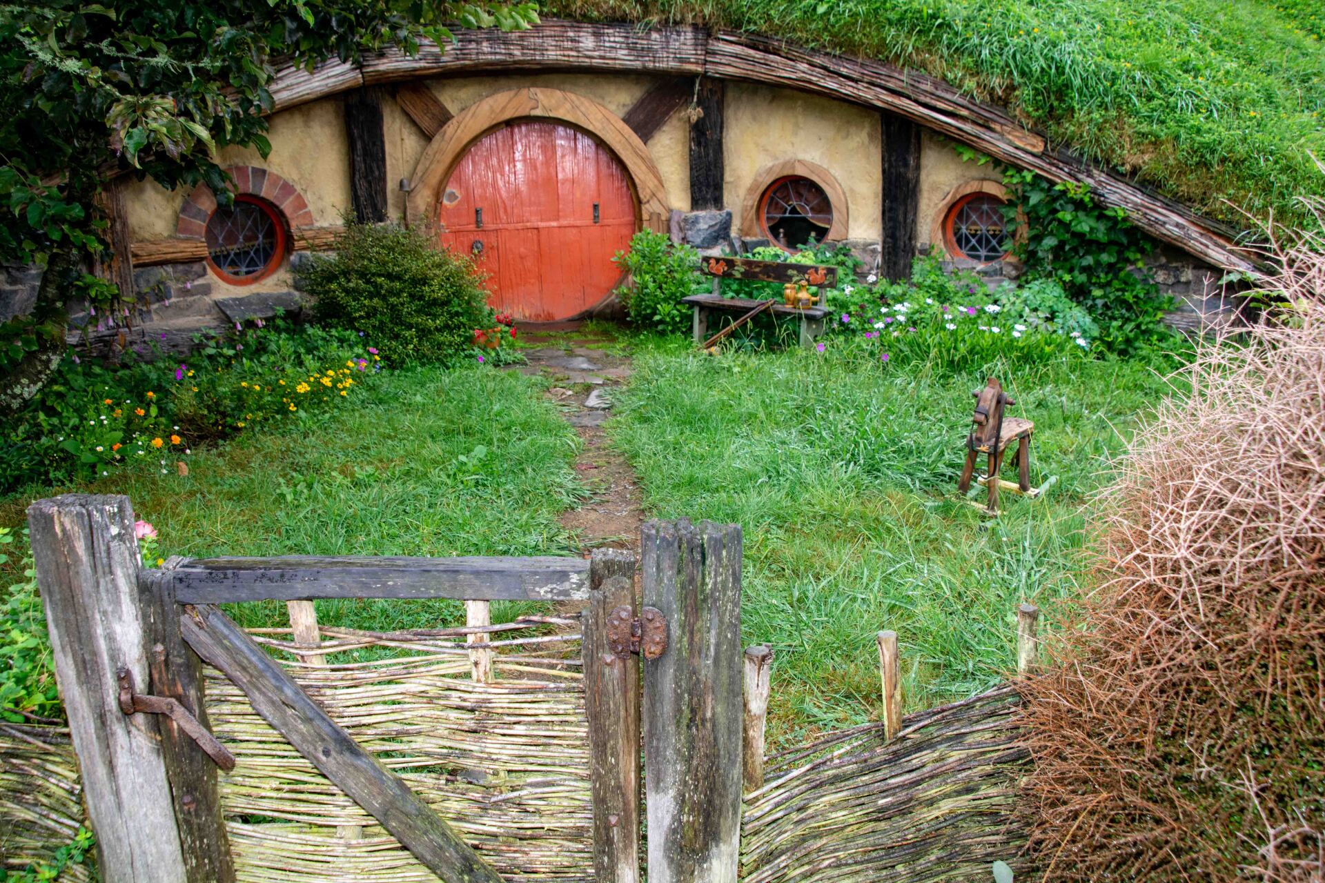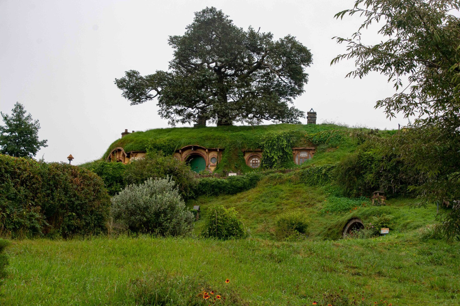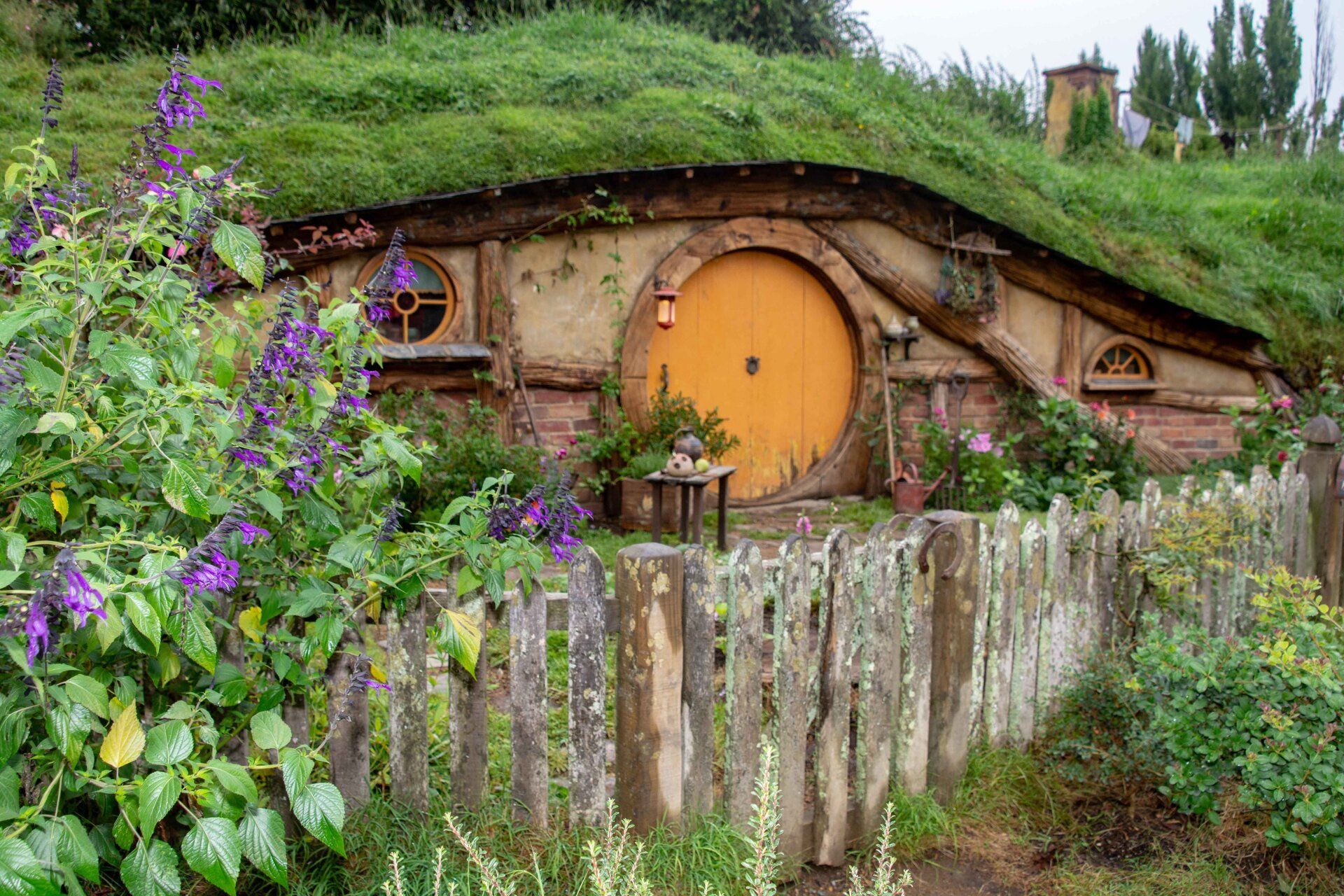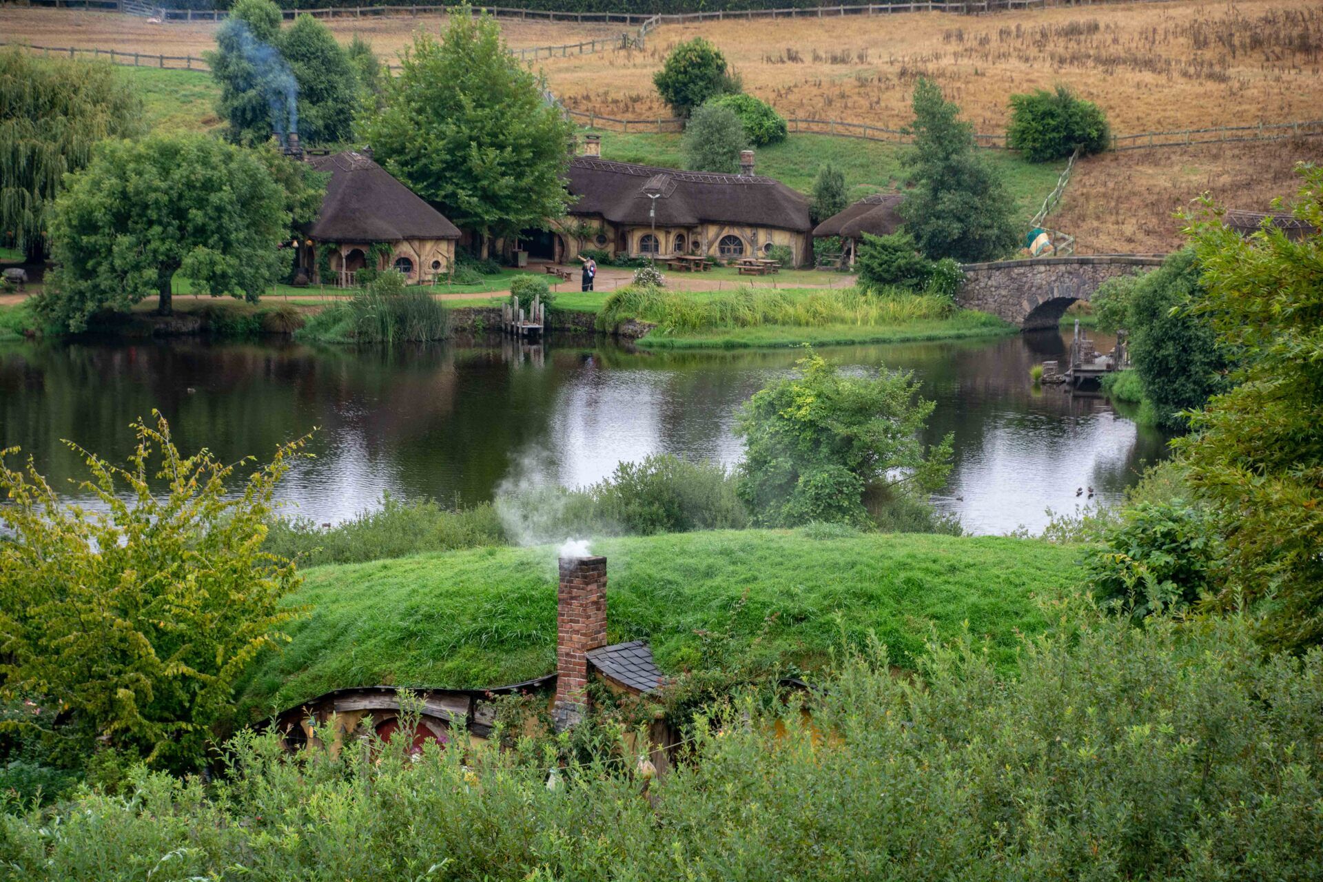 Hobbiton-Movie-Set, die Kulissen sind bekannt aus den Filmen "Herr der Ringe" und "Hobbits". Obwohl die Kulisse nur wenige Minuten in den Filmen zu sehen ist, wurde hier ein riesiger Aufwand betrieben, um 37 Erdhügel-Wohneinheiten mit den bekannten kreisrunden Türen und Fenstern hier in die Hügel zu bauen. Für jeden Beruf im Dorf eines, z.B. für den Fischer, den Imker, den Schreiner, den Maler, den Käser, den Floristen, den Bäcker und am höchsten Punkt des Hügels das Haus von Bilbo Beutlin. Alles mit sehr viel Liebe zum Detail. Obwohl alles nur Kulissen sind, werden die Gärten täglich gepflegt, bevor die Besucher kommen und man lässt auch die Schornsteine rauchen, so bekommt man den Eindruck eines lebenden Dorfes, als wären die Bewohner nur mal kurz weg. Alle 8 Minuten wird ein Bus voll Besucher abgeladen und schätzungsweise 10 Gruppen sind ständig gleichzeitig im Gelände unterwegs - dies ist aber perfekt gesteuert und die Besuchermassen stören kaum und verlieren sich in dem großen hügeligen Gelände. Am Ende sind am See dann die einzigen richtigen Gebäude mit der Mühle, der Schmiede und dem Gastlokal, dem "Green Dragon" und der berühmten kleinen Steinbogenbrücke. Im Green Dragon hatten wir dann einen Apfelwein im gemütlichen Sessel vor dem brennenden offenen Kamin. In der Nähe der Ostküste machten wir 2005 einen kurzen Stopp an der