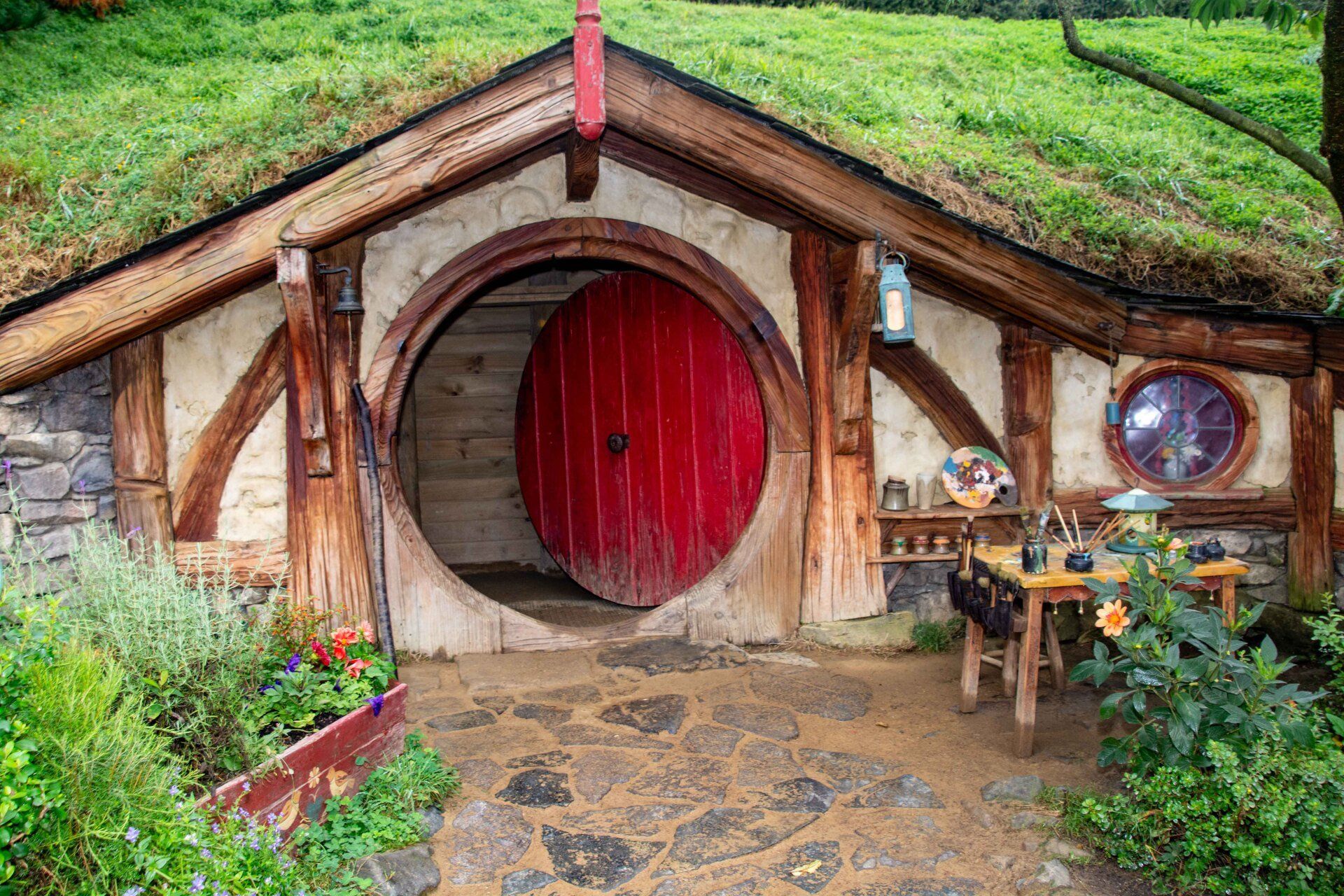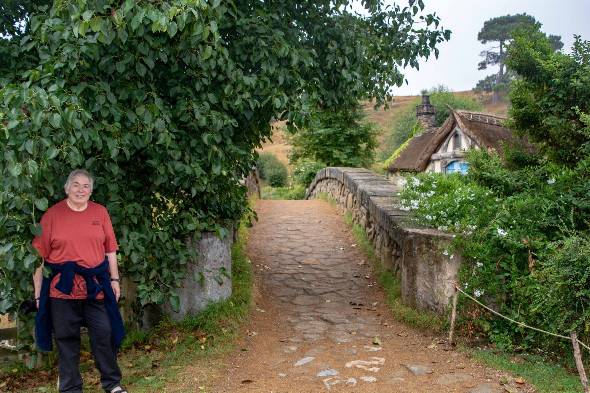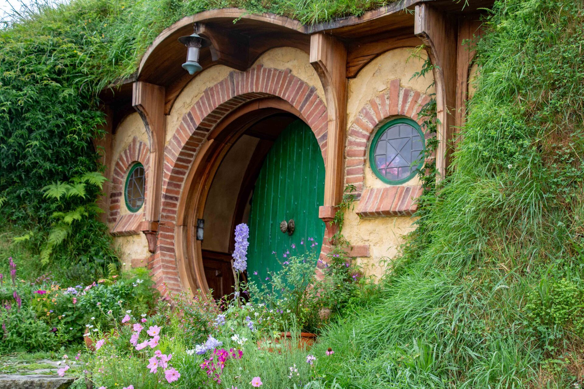 Hobbiton-Movie-Set, die Kulissen sind bekannt aus den Filmen "Herr der Ringe" und "Hobbits". Obwohl die Kulisse nur wenige Minuten in den Filmen zu sehen ist, wurde hier ein riesiger Aufwand betrieben, um 37 Erdhügel-Wohneinheiten mit den bekannten kreisrunden Türen und Fenstern hier in die Hügel zu bauen. Für jeden Beruf im Dorf eines, z.B. für den Fischer, den Imker, den Schreiner, den Maler, den Käser, den Floristen, den Bäcker und am höchsten Punkt des Hügels das Haus von Bilbo Beutlin. Alles mit sehr viel Liebe zum Detail. Obwohl alles nur Kulissen sind, werden die Gärten täglich gepflegt, bevor die Besucher kommen und man lässt auch die Schornsteine rauchen, so bekommt man den Eindruck eines lebenden Dorfes, als wären die Bewohner nur mal kurz weg. Alle 8 Minuten wird ein Bus voll Besucher abgeladen und schätzungsweise 10 Gruppen sind ständig gleichzeitig im Gelände unterwegs - dies ist aber perfekt gesteuert und die Besuchermassen stören kaum und verlieren sich in dem großen hügeligen Gelände. Am Ende sind am See dann die einzigen richtigen Gebäude mit der Mühle, der Schmiede und dem Gastlokal, dem "Green Dragon" und der berühmten kleinen Steinbogenbrücke. Im Green Dragon hatten wir dann einen Apfelwein im gemütlichen Sessel vor dem brennenden offenen Kamin. In der Nähe der Ostküste machten wir 2005 einen kurzen Stopp an der