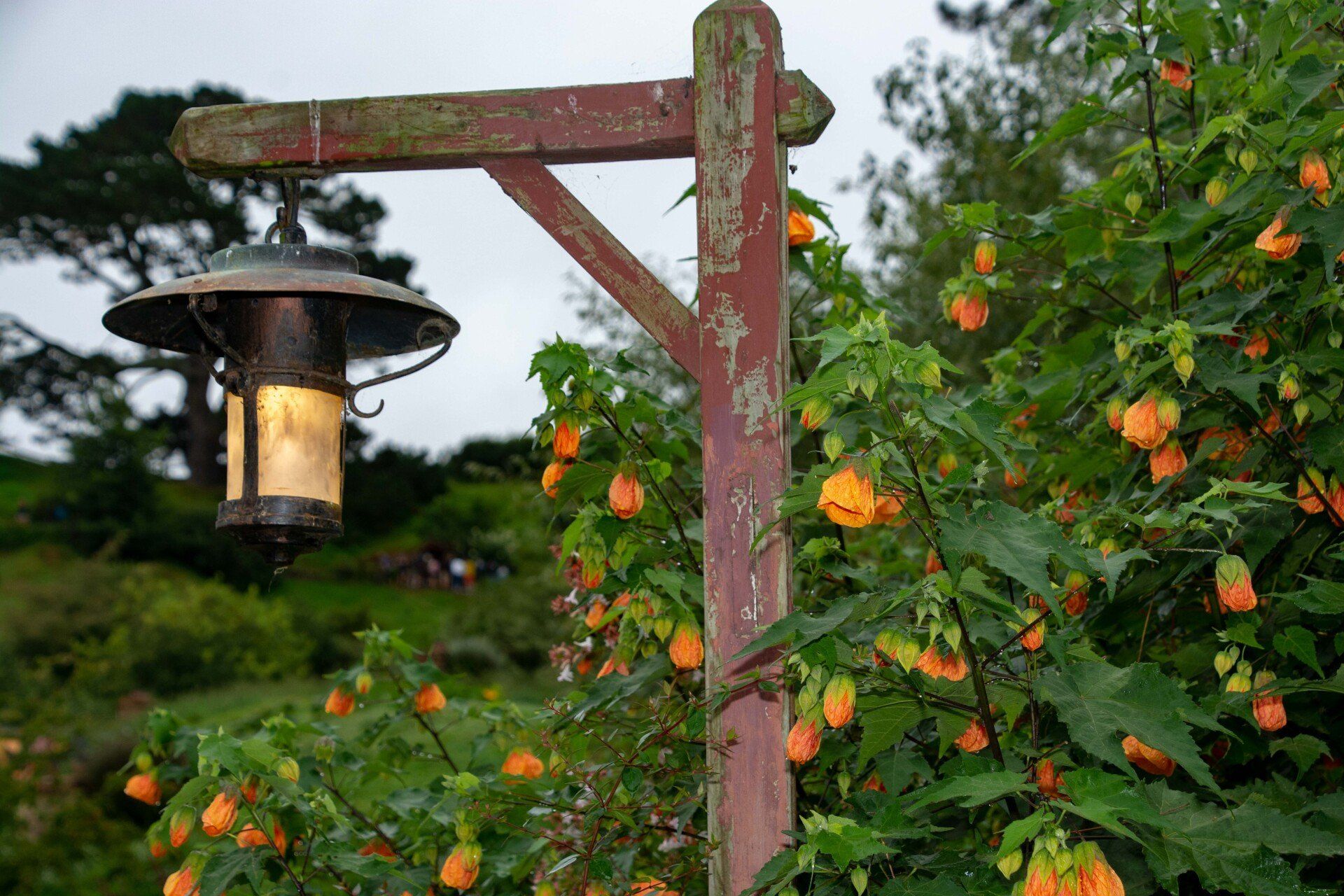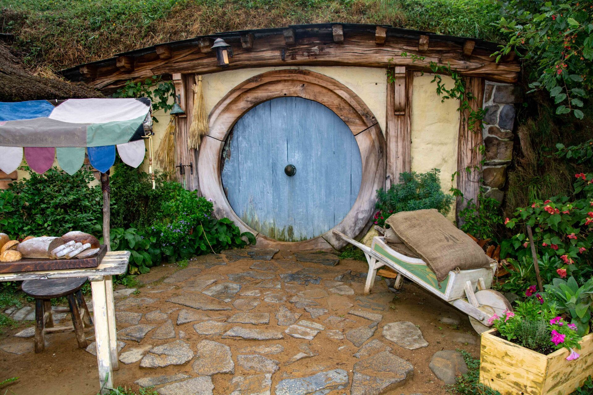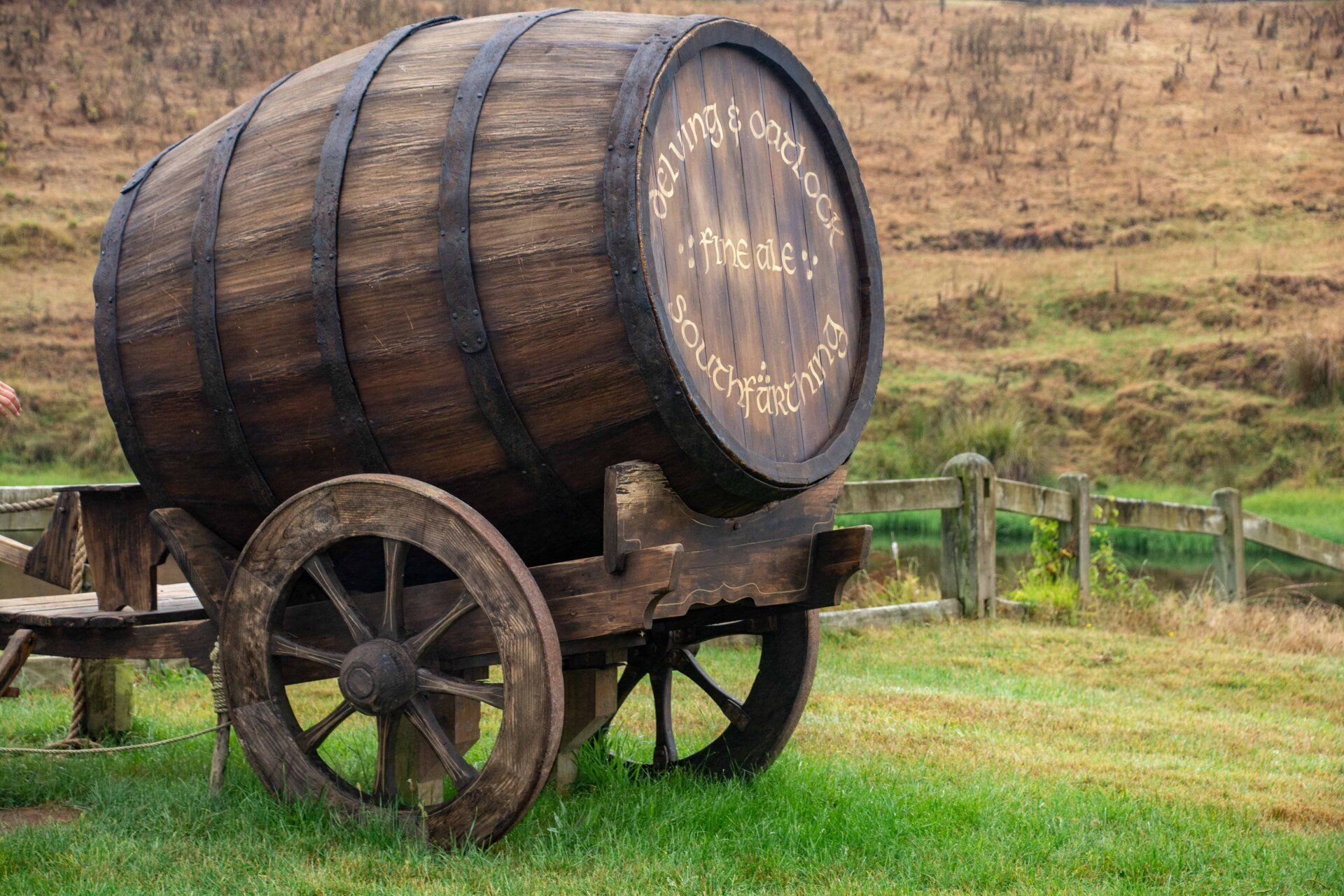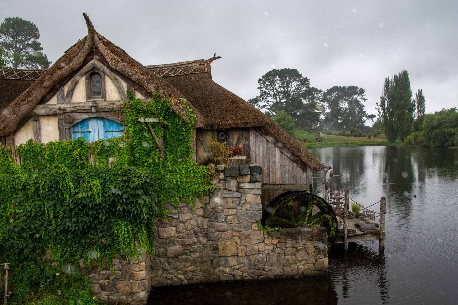 Hobbiton-Movie-Set, die Kulissen sind bekannt aus den Filmen "Herr der Ringe" und "Hobbits". Obwohl die Kulisse nur wenige Minuten in den Filmen zu sehen ist, wurde hier ein riesiger Aufwand betrieben, um 37 Erdhügel-Wohneinheiten mit den bekannten kreisrunden Türen und Fenstern hier in die Hügel zu bauen. Für jeden Beruf im Dorf eines, z.B. für den Fischer, den Imker, den Schreiner, den Maler, den Käser, den Floristen, den Bäcker und am höchsten Punkt des Hügels das Haus von Bilbo Beutlin. Alles mit sehr viel Liebe zum Detail. Obwohl alles nur Kulissen sind, werden die Gärten täglich gepflegt, bevor die Besucher kommen und man lässt auch die Schornsteine rauchen, so bekommt man den Eindruck eines lebenden Dorfes, als wären die Bewohner nur mal kurz weg. Alle 8 Minuten wird ein Bus voll Besucher abgeladen und schätzungsweise 10 Gruppen sind ständig gleichzeitig im Gelände unterwegs - dies ist aber perfekt gesteuert und die Besuchermassen stören kaum und verlieren sich in dem großen hügeligen Gelände. Am Ende sind am See dann die einzigen richtigen Gebäude mit der Mühle, der Schmiede und dem Gastlokal, dem "Green Dragon" und der berühmten kleinen Steinbogenbrücke. Im Green Dragon hatten wir dann einen Apfelwein im gemütlichen Sessel vor dem brennenden offenen Kamin. In der Nähe der Ostküste machten wir 2005 einen kurzen Stopp an der